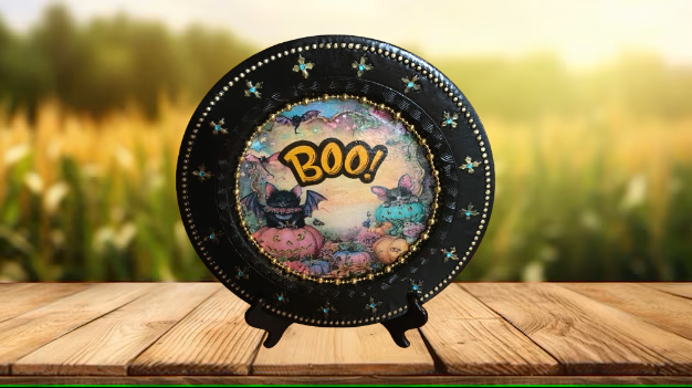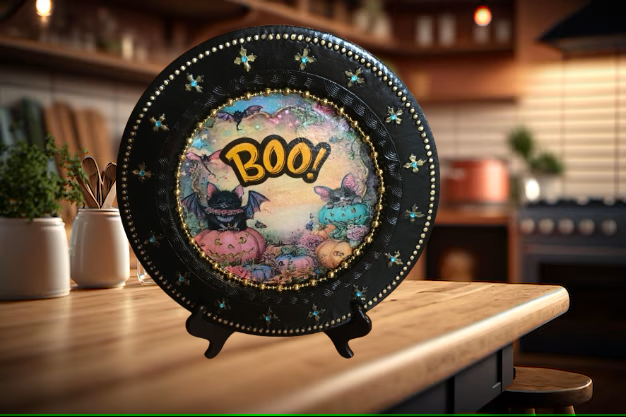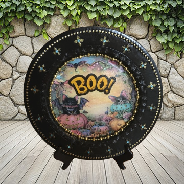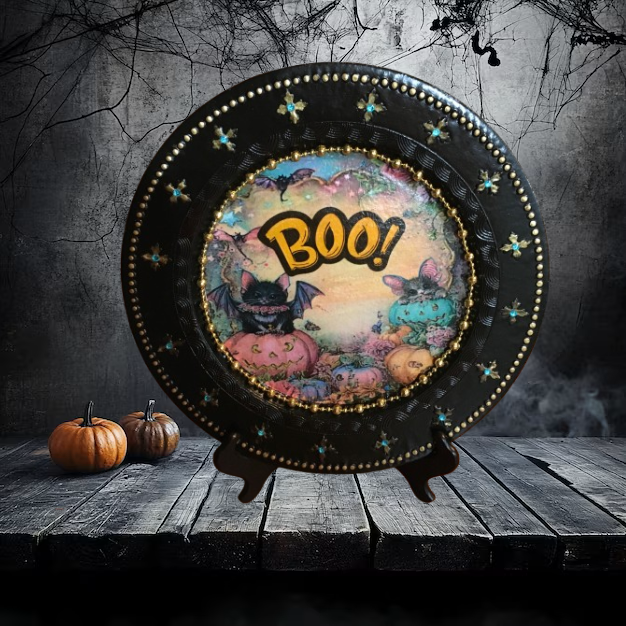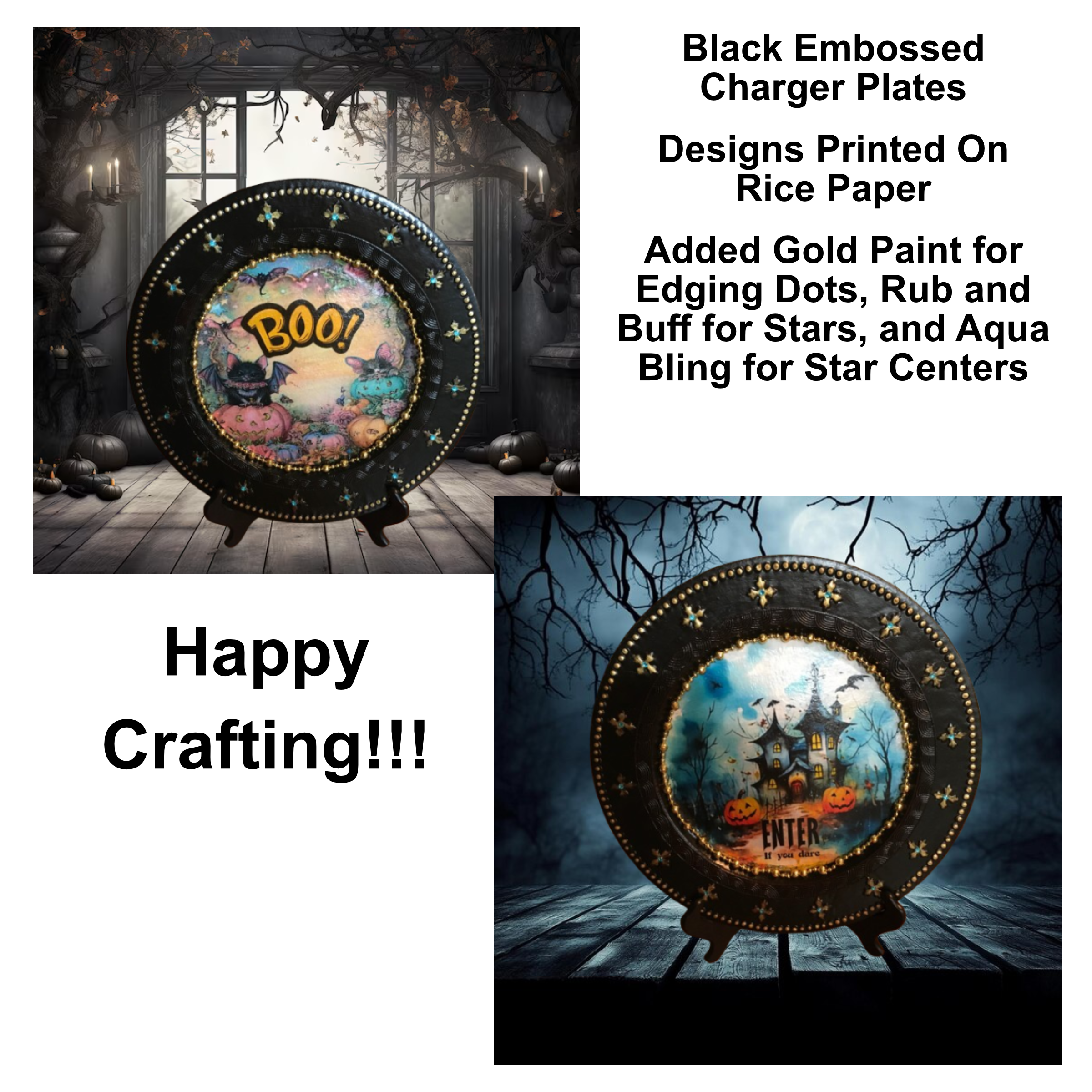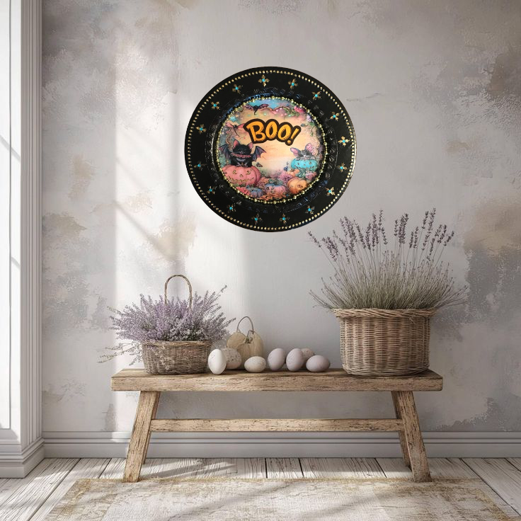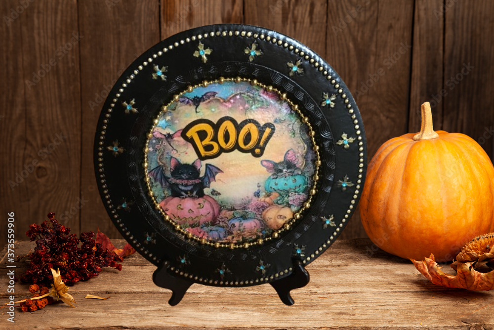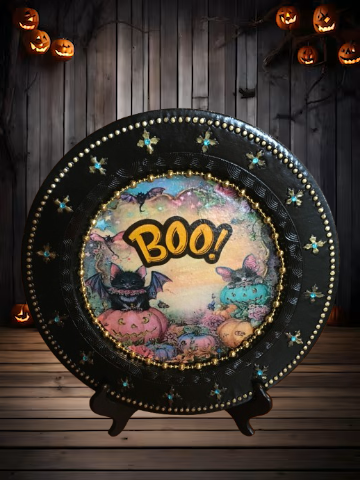 CHARGER PLATE BLACK PLASTIC ROUND Halloweens DECOUPAGED Upcycled Repurposed Wall Art or Shelf Sitter BOO Holiday Home Decor Gift - JAMsCraftCloset