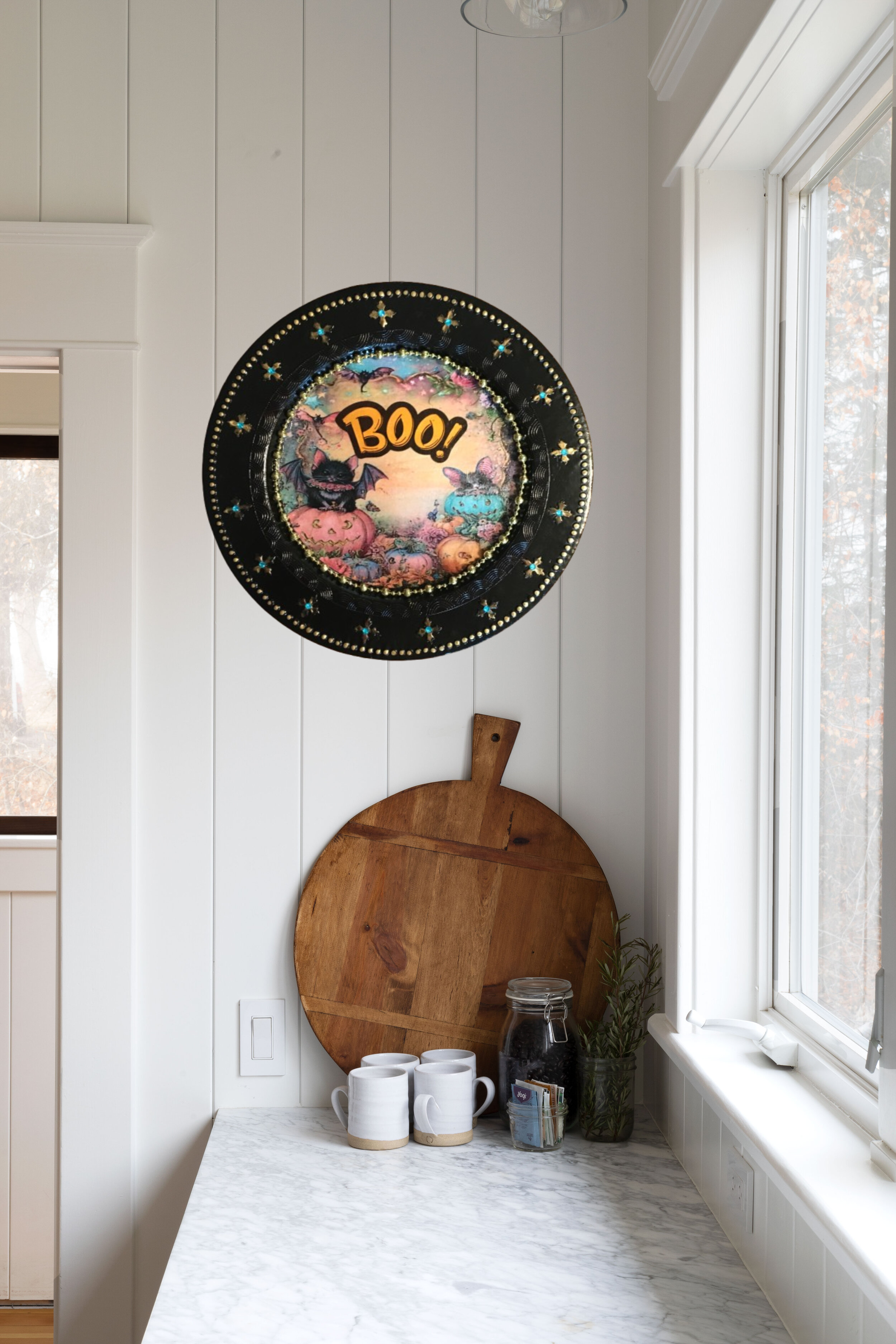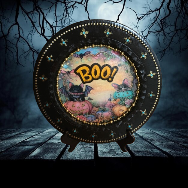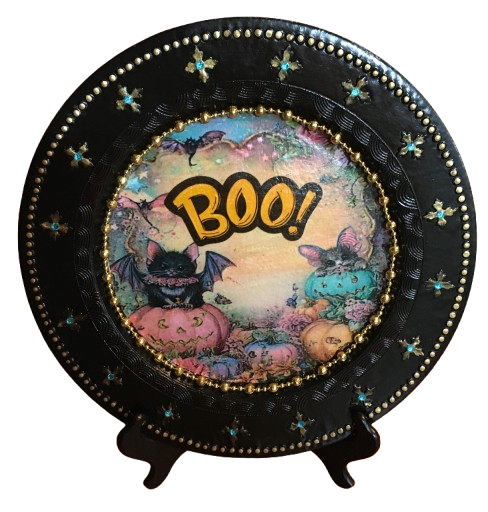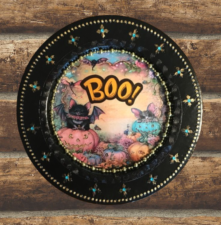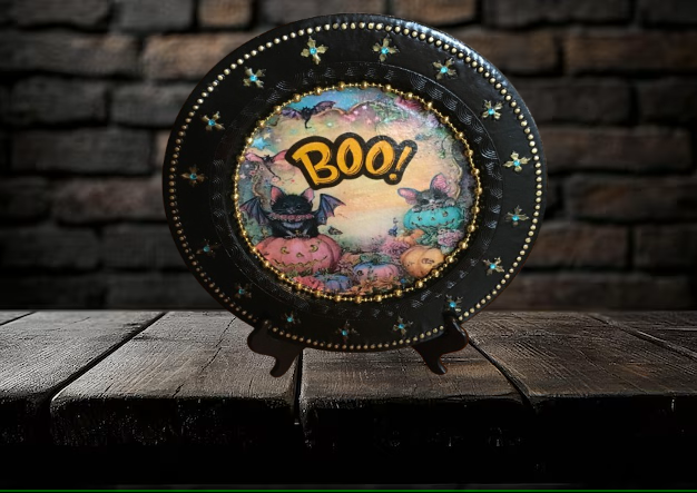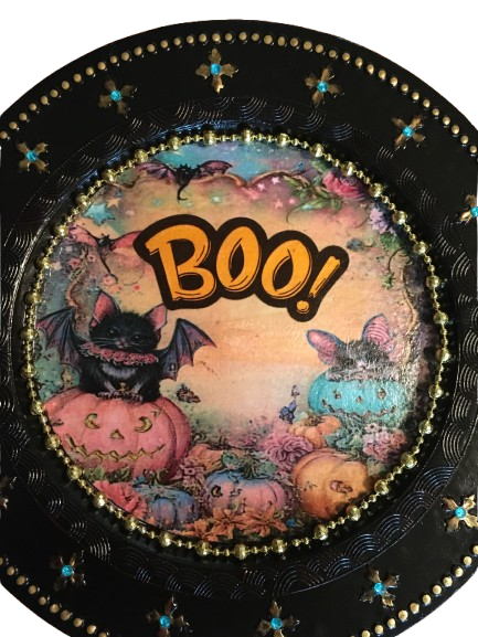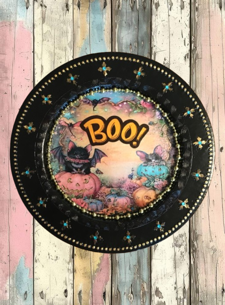CHARGER PLATE BLACK PLASTIC ROUND Halloweens DECOUPAGED Upcycled Repurposed Wall Art or Shelf Sitter BOO Holiday Home Decor Gift