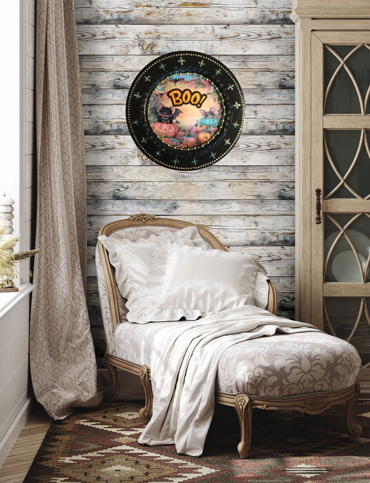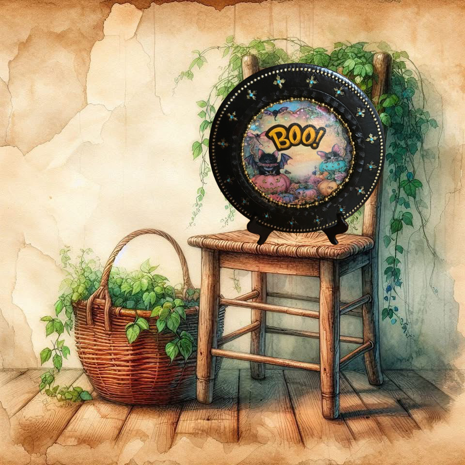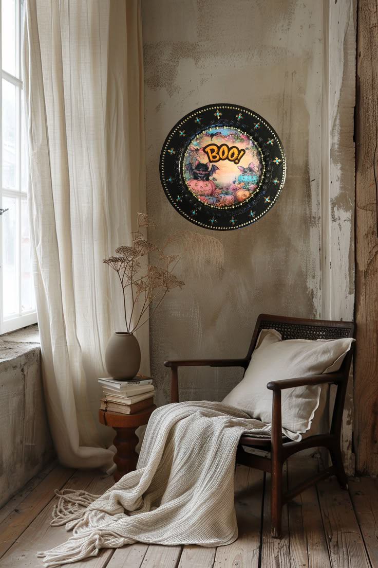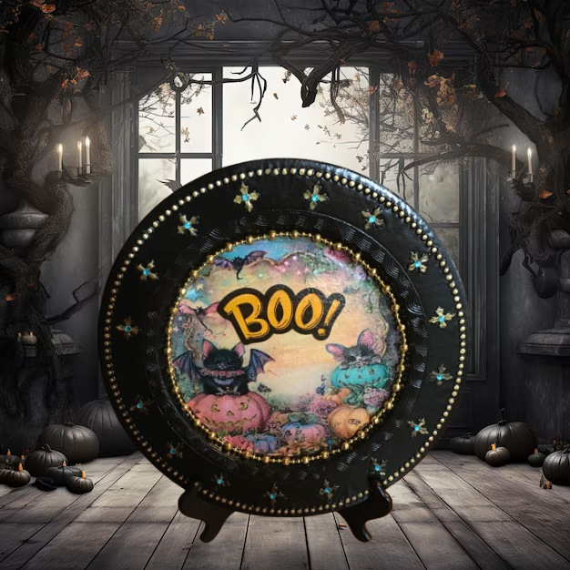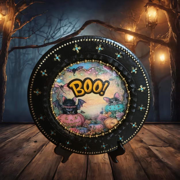 CHARGER PLATE BLACK PLASTIC ROUND Halloweens DECOUPAGED Upcycled Repurposed Wall Art or Shelf Sitter BOO Holiday Home Decor Gift