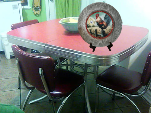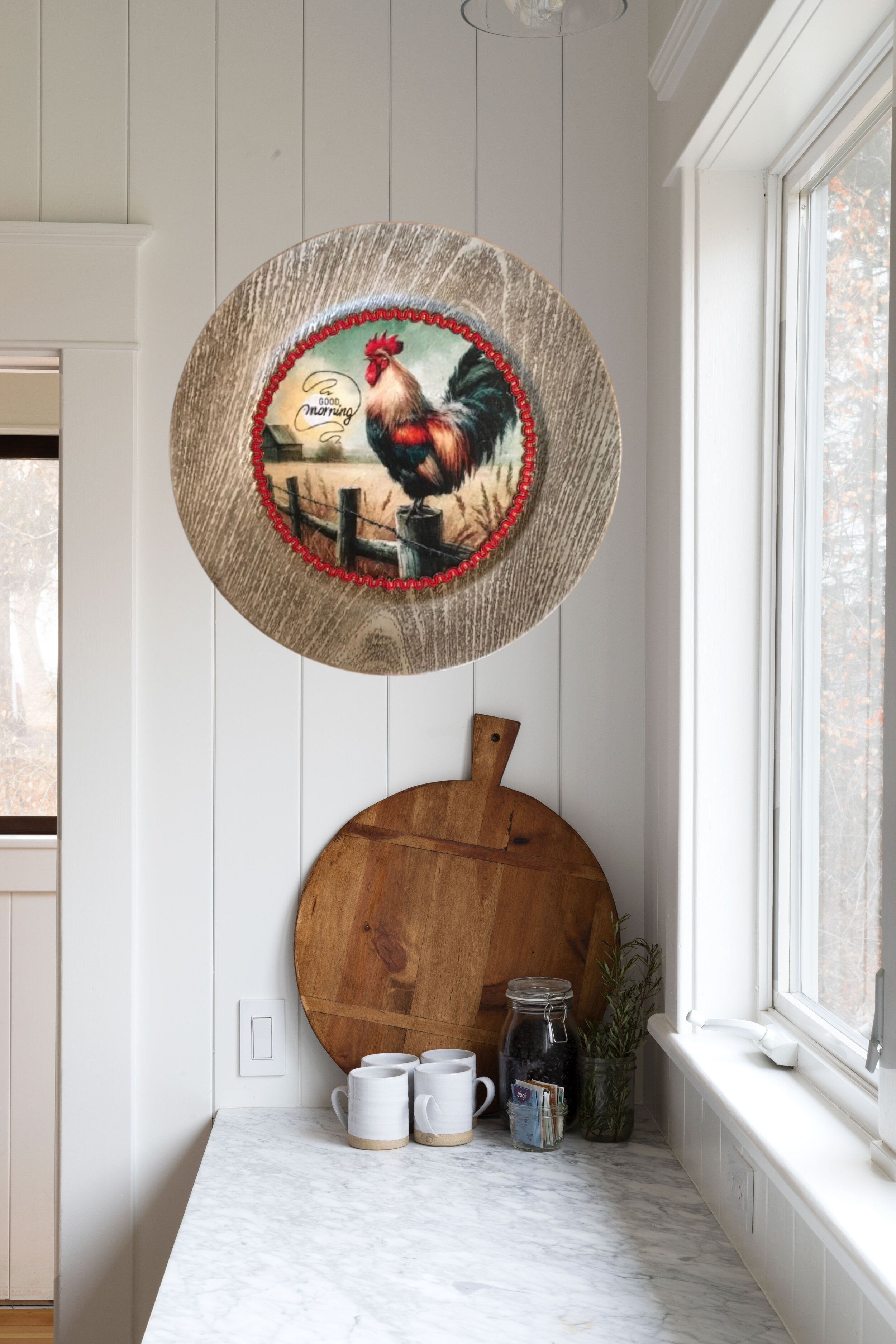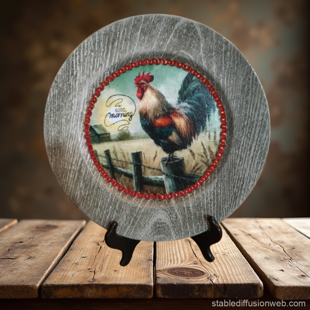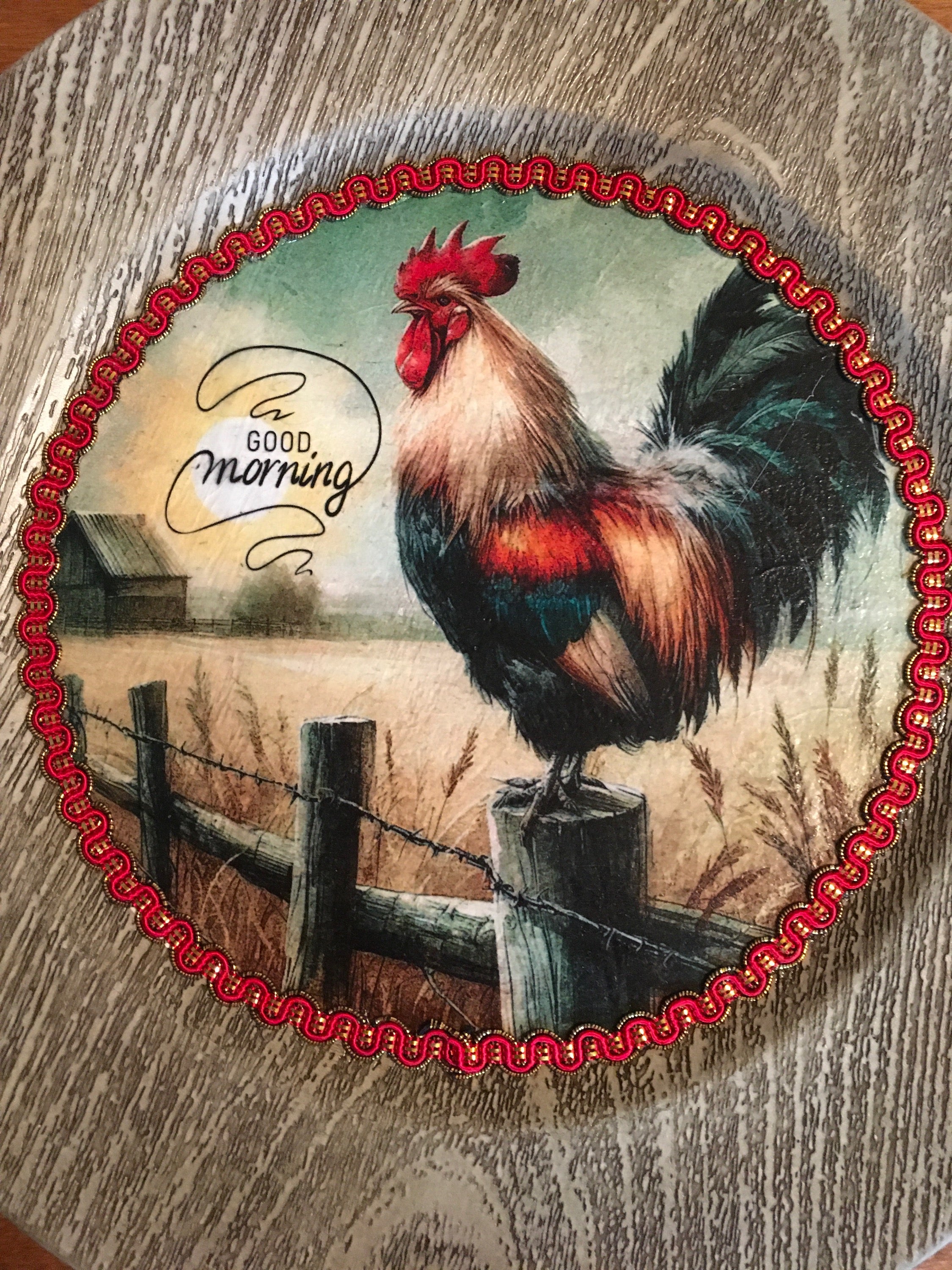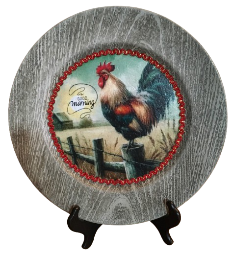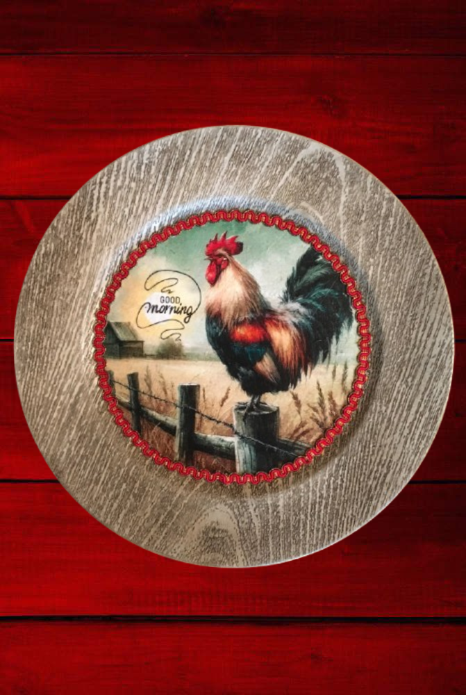 CHARGER PLATE GRAYISH BROWN WOODGRAIN PLASTIC ROUND - GOOD MORNING - ROOSTER - DECOUPAGE Upcycled Repurposed Wall Art or Shelf Sitter KITCHEN Home Decor Gift