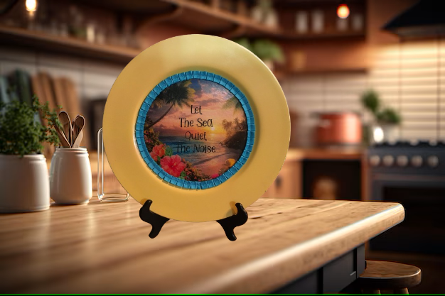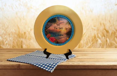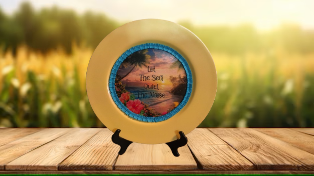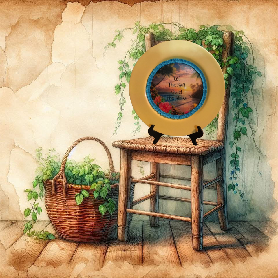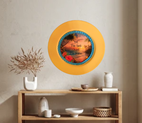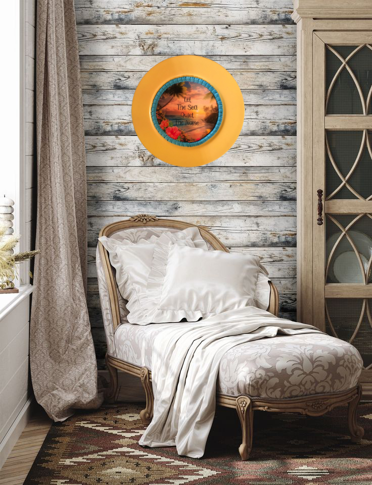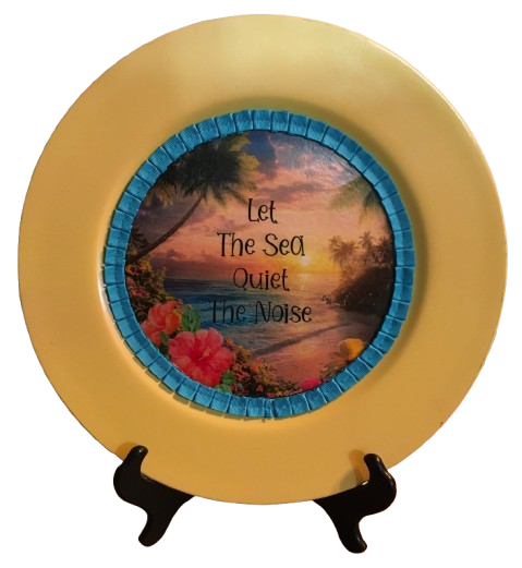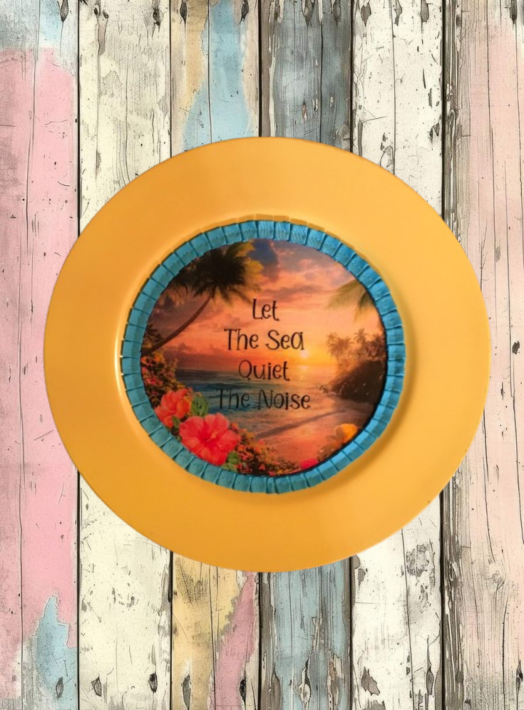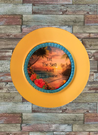 CHARGER PLATE YELLOW PLASTIC ROUND BEACH THEME - DECOUPAGED Upcycled Repurposed Wall Art or Shelf Sitter LET THE SEA QUIET THE NOISE Home Decor Gift - JAMsCraftCloset