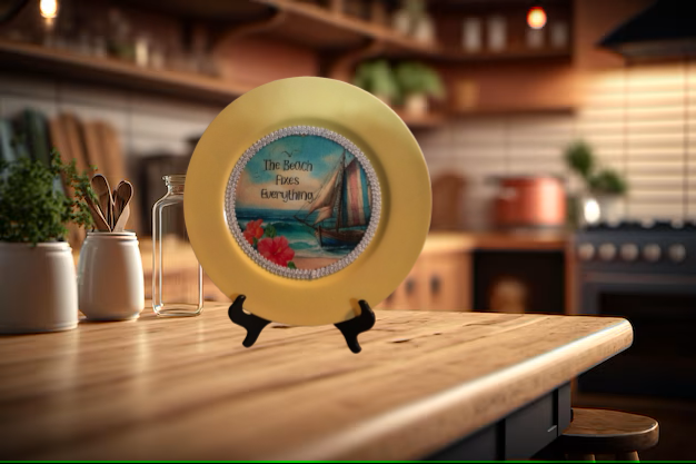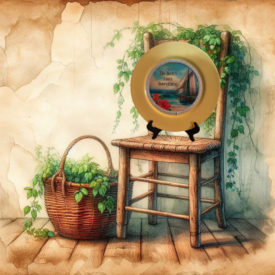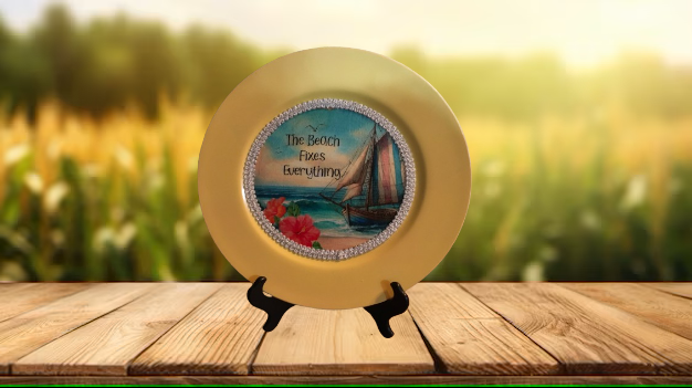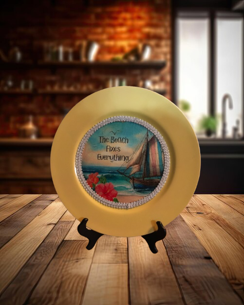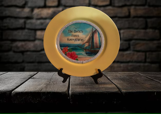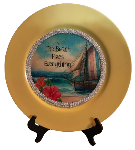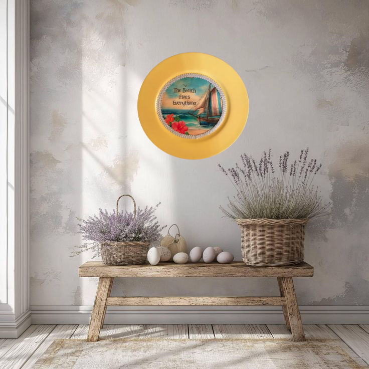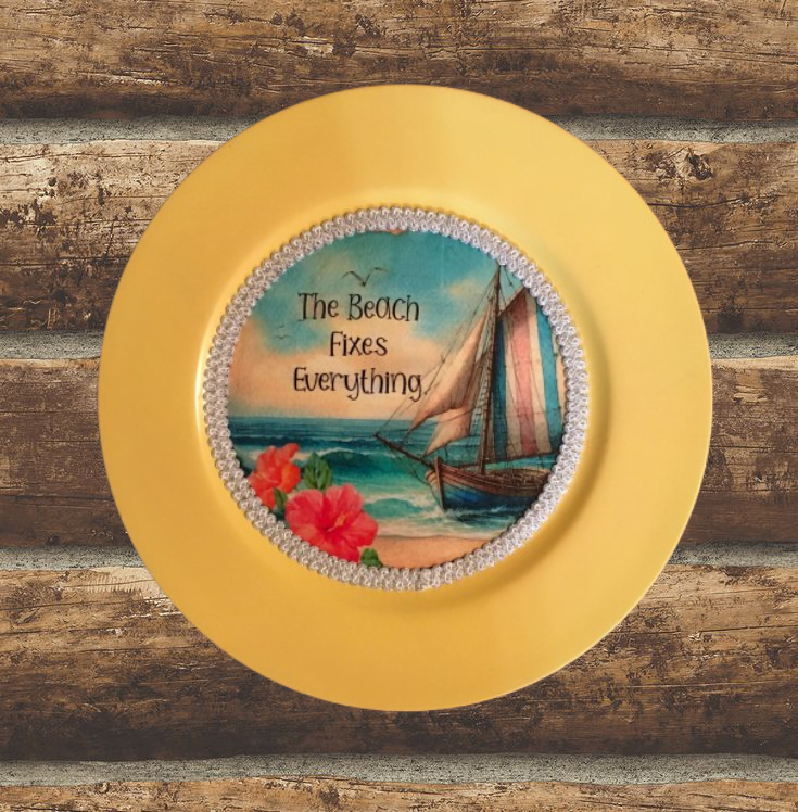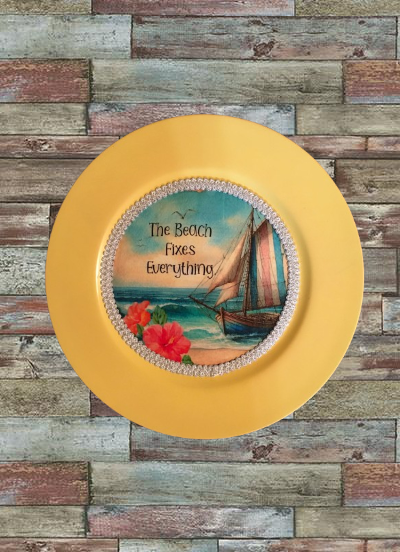 CHARGER PLATE YELLOW PLASTIC ROUND BEACH THEME - DECOUPAGED Upcycled Repurposed Wall Art or Shelf Sitter THE BEACH FIXES EVERYTHING Home Decor Gift - JAMsCraftCloset