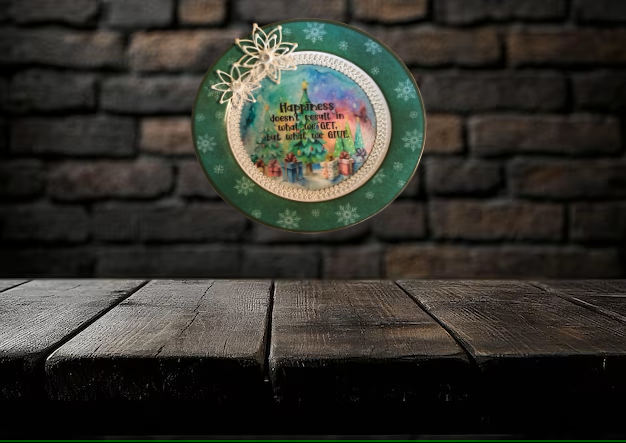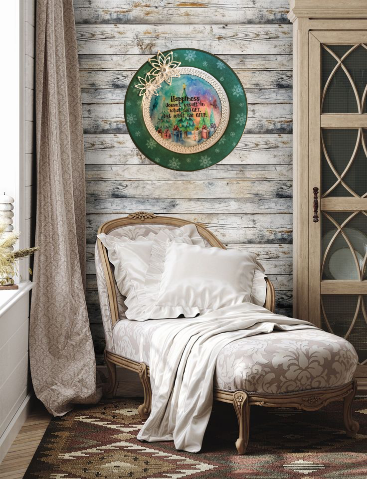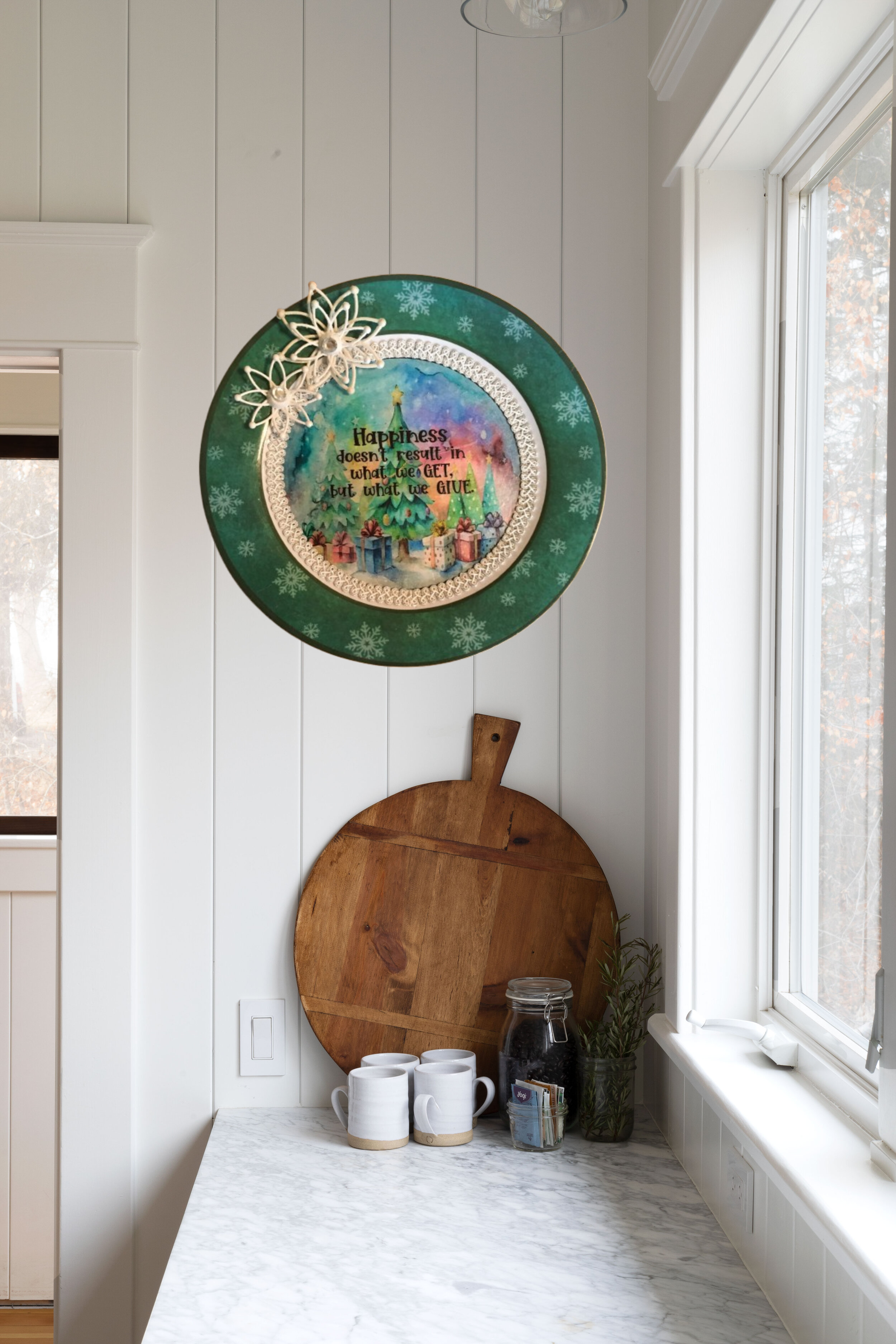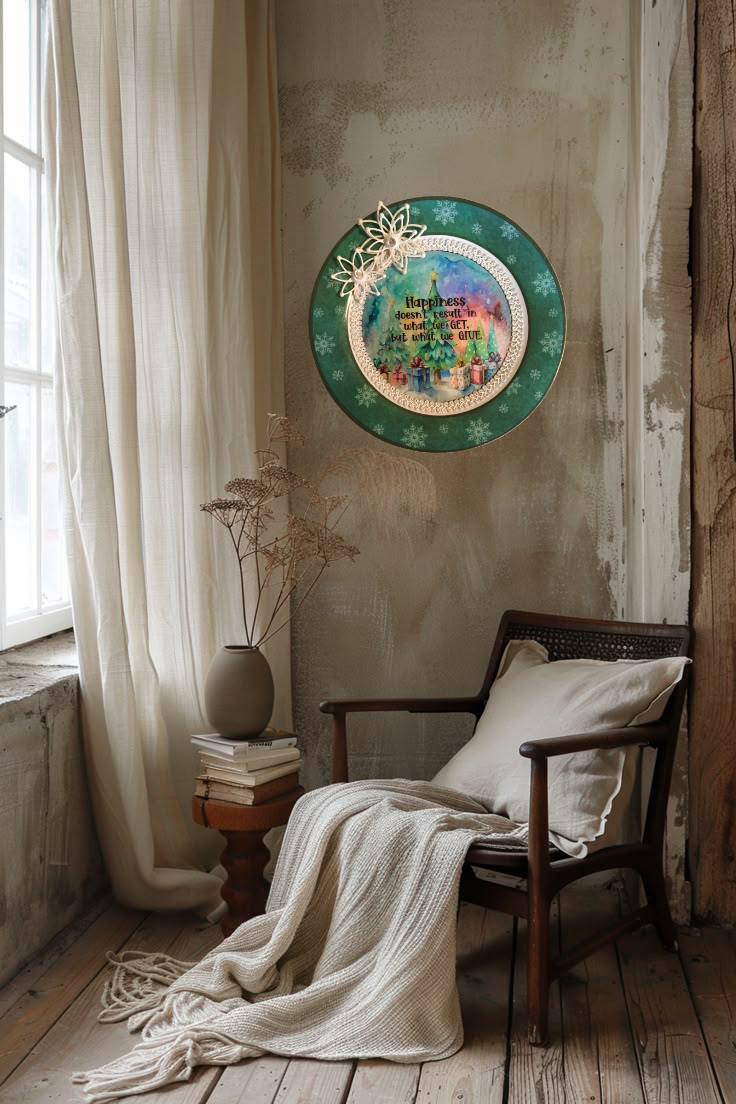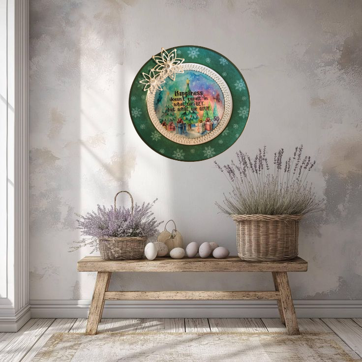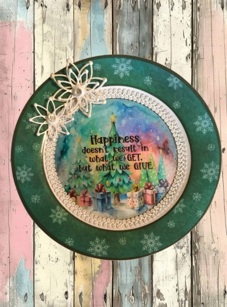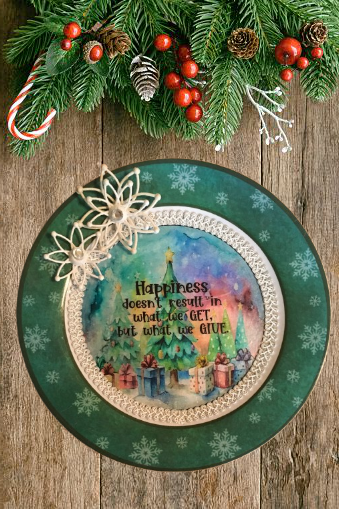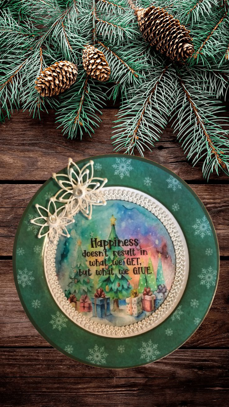 PLATE PLASTIC ROUND Christmas DECOUPAGED Upcycled Repurposed Wall Art or Shelf Sitter HAPPINESS DOESN'T RESULT IN WHAT WE GET Holiday Home Decor Gift