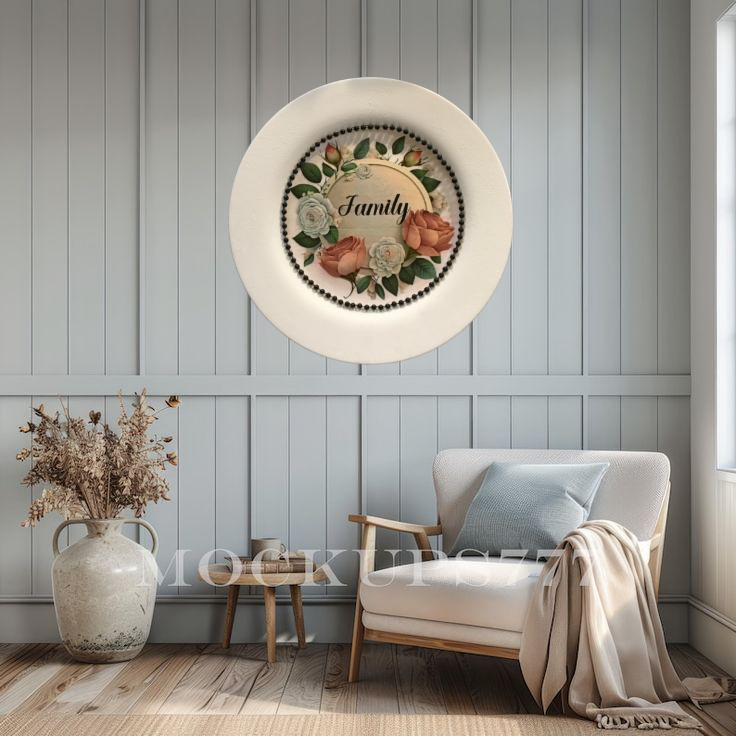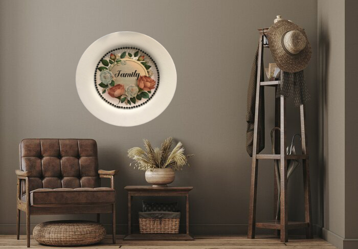 TRAY WHITE PLASTIC ROUND Decoupaged Hand Painted Upcycled Repurposed FAMILY With ROSES - Home Decor Wall Art Shelf Sitter Gift