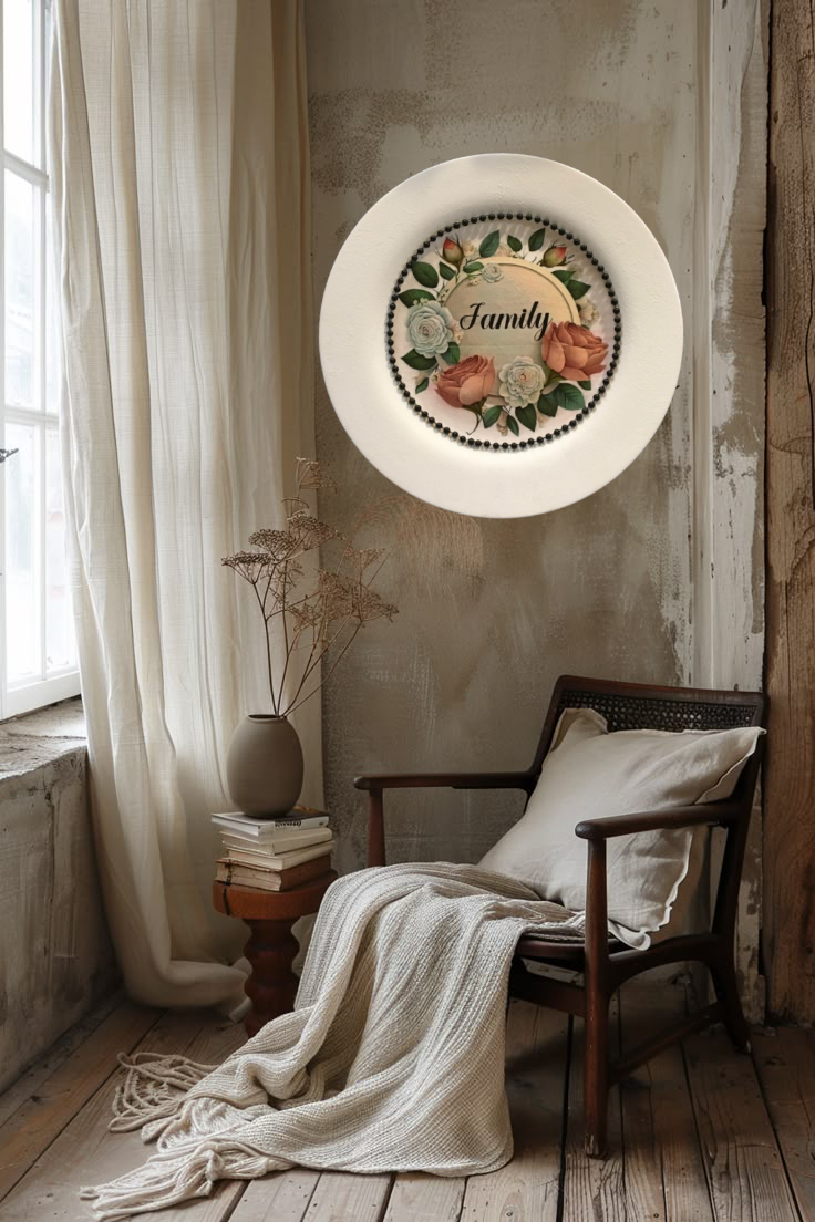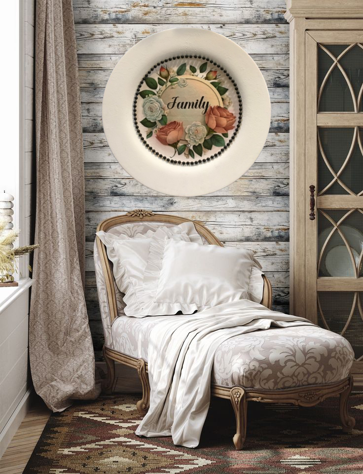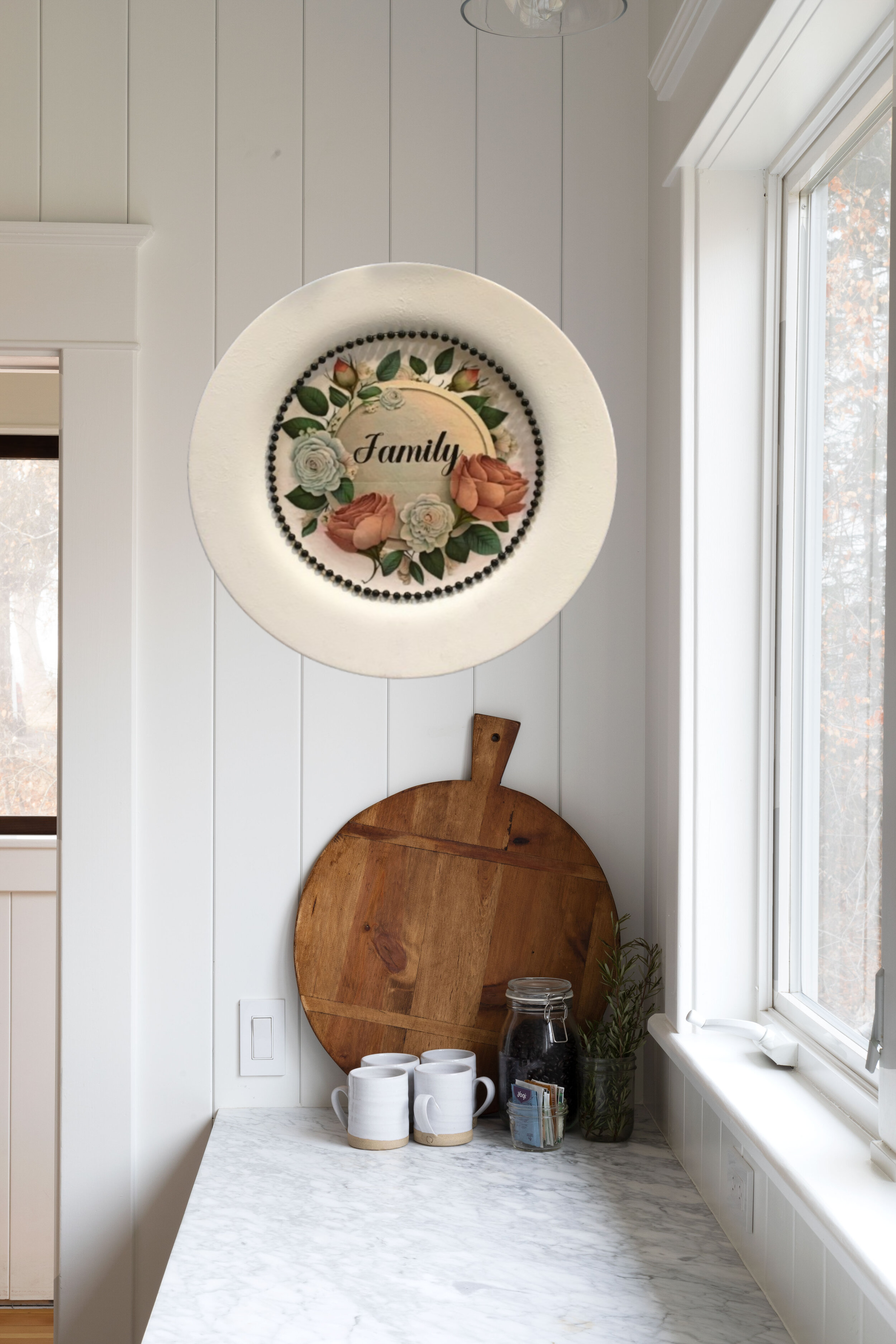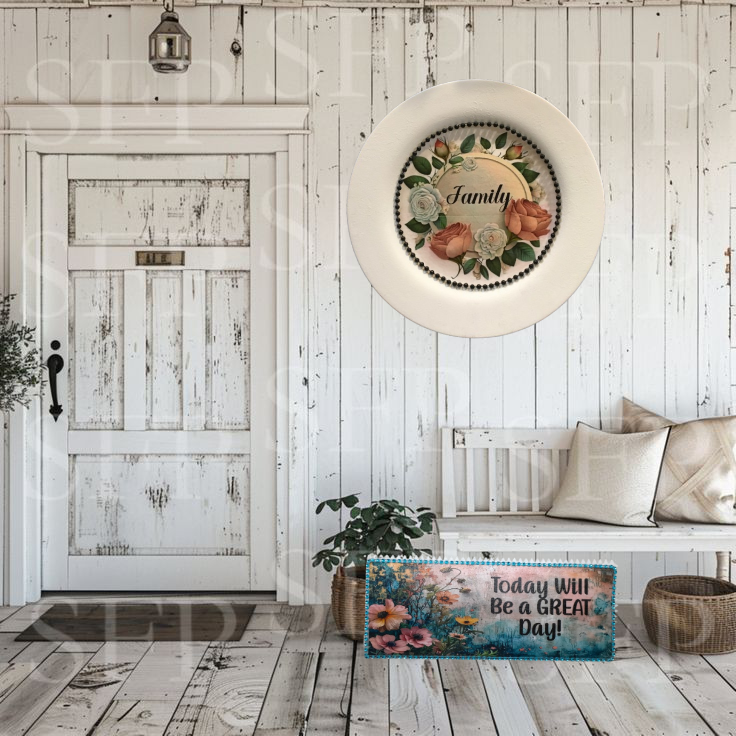 TRAY WHITE PLASTIC ROUND Decoupaged Hand Painted Upcycled Repurposed FAMILY With ROSES - Home Decor Wall Art Shelf Sitter Gift - JAMsCraftCloset