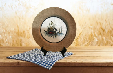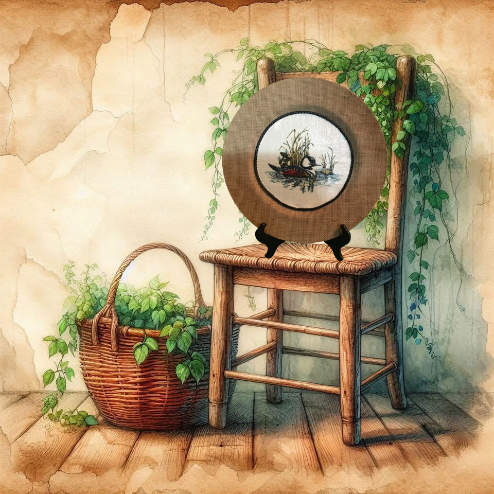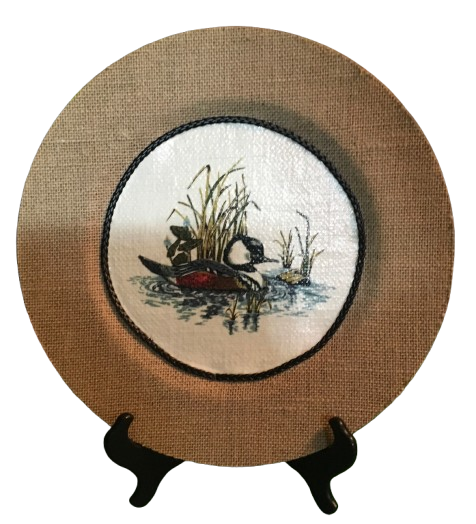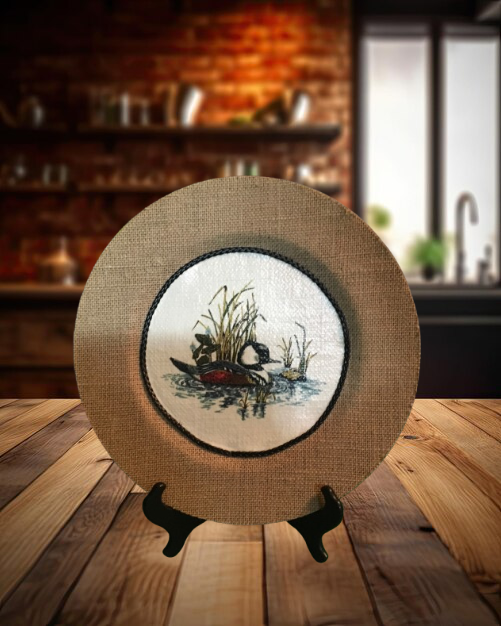 CHARGER PLATE Tan BURLAP Covered PLASTIC ROUND - DUCK SWIMMING RIGHT - CRANSTON FABRIC PRINT DECOUPAGE Upcycled Wall Art - Shelf Sitter Man Cave Home Decor Gift - JAMsCraftCloset