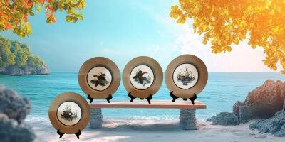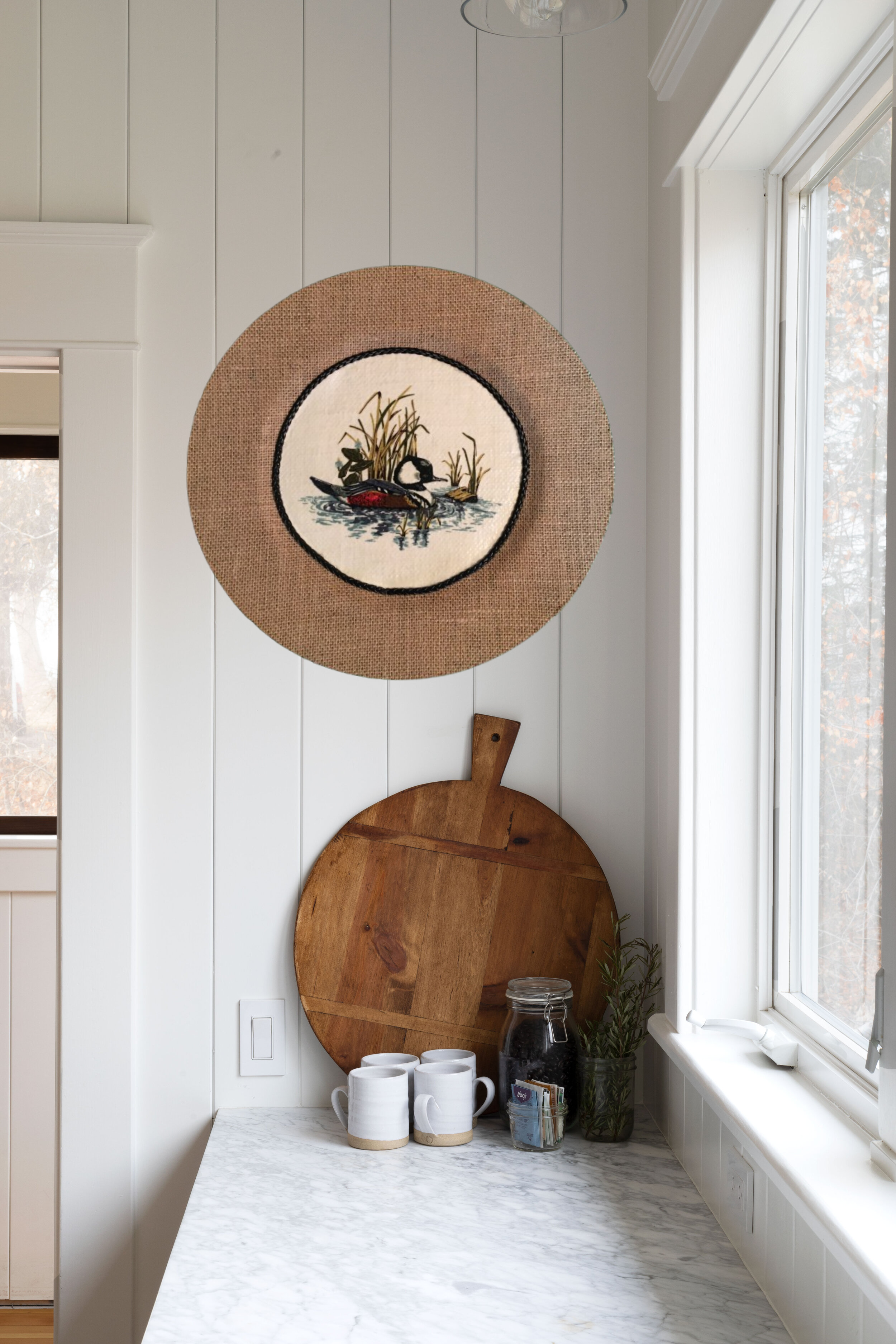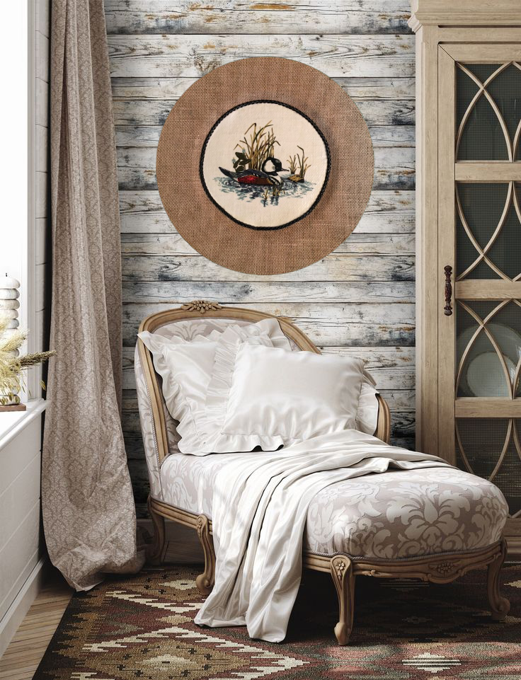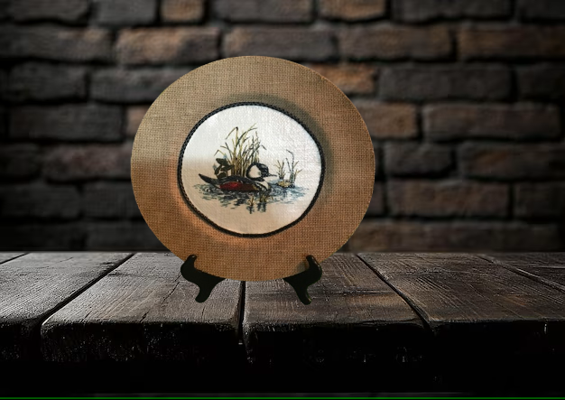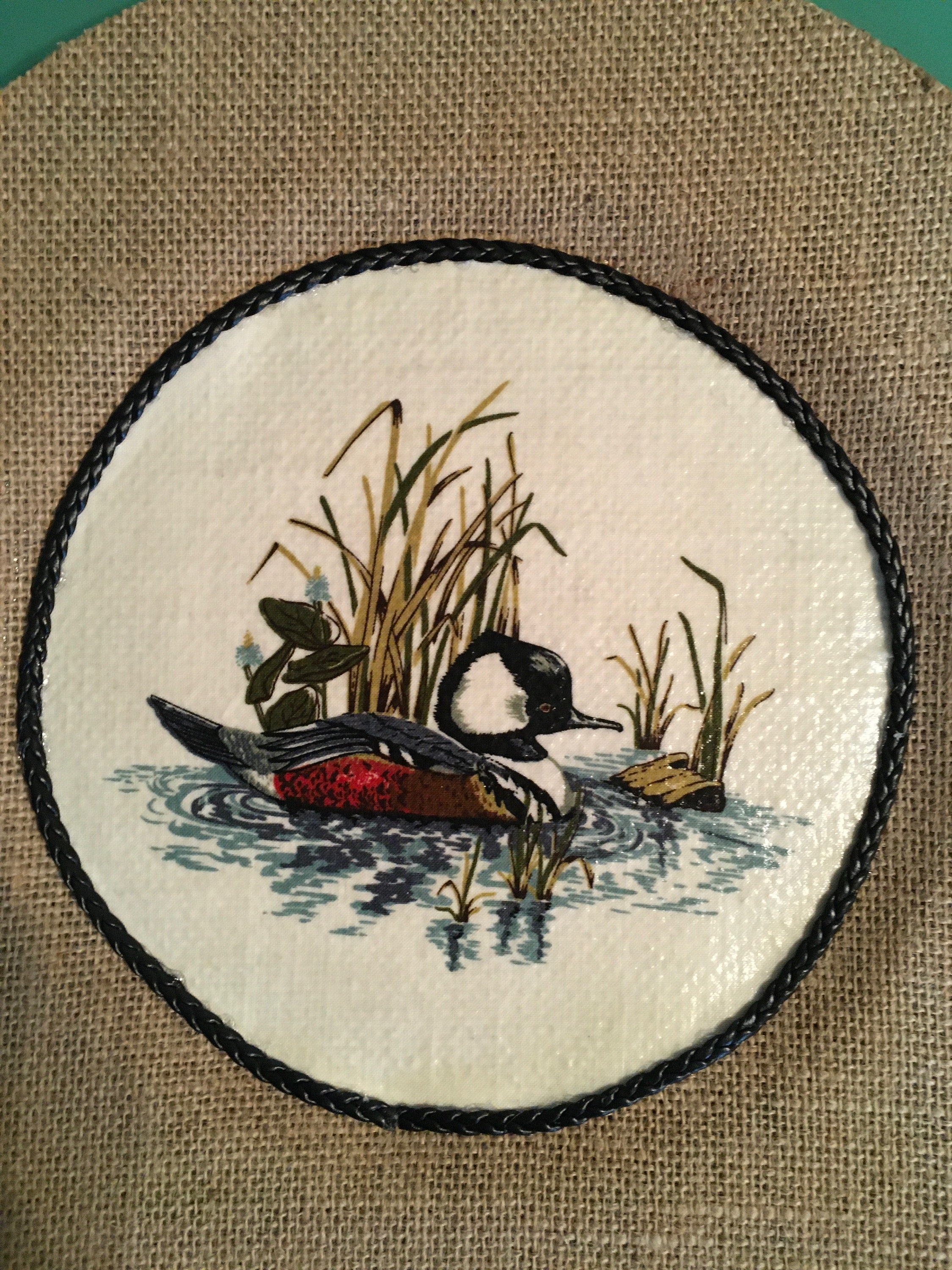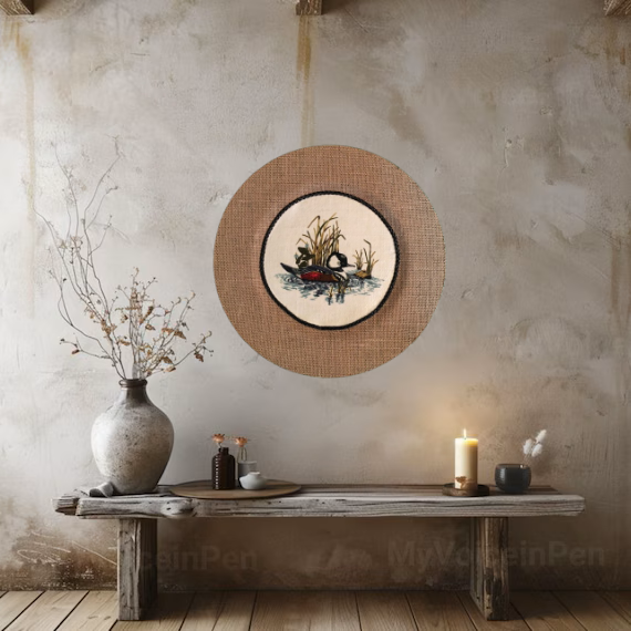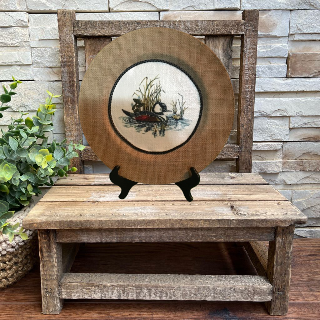 CHARGER PLATE Tan BURLAP Covered PLASTIC ROUND - DUCK SWIMMING RIGHT - CRANSTON FABRIC PRINT DECOUPAGE Upcycled Wall Art - Shelf Sitter Man Cave Home Decor Gift