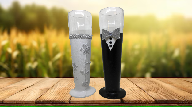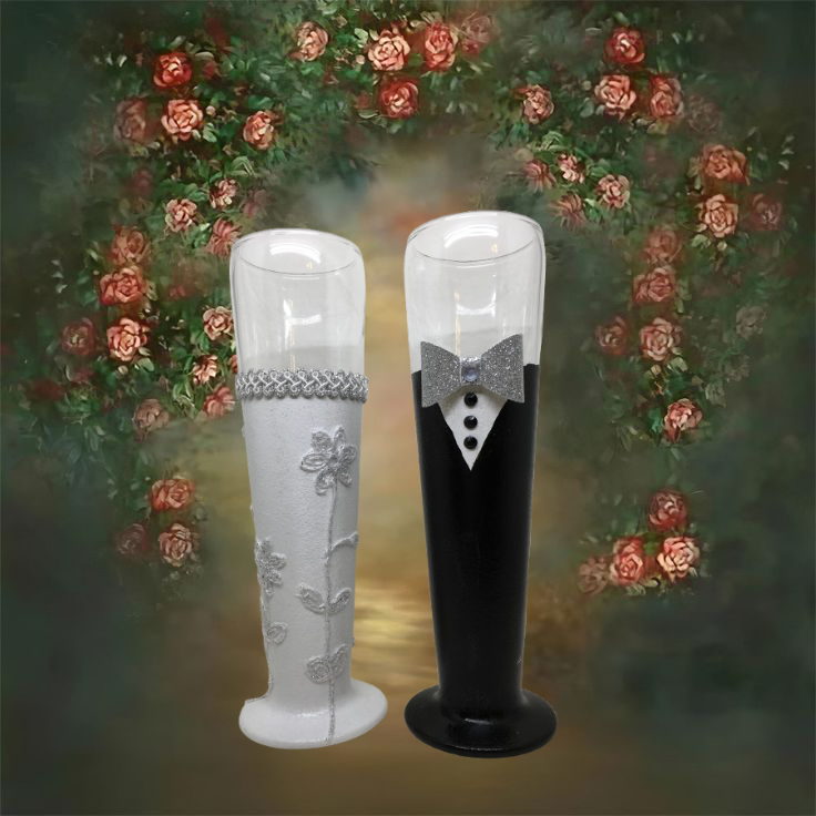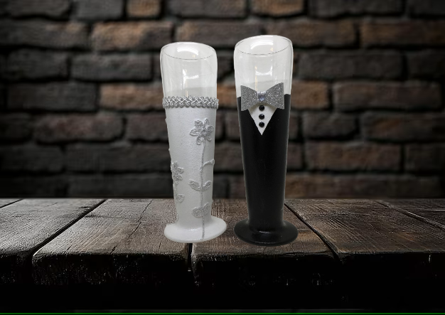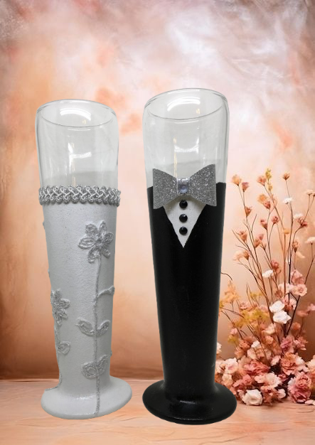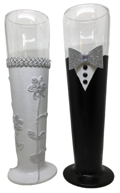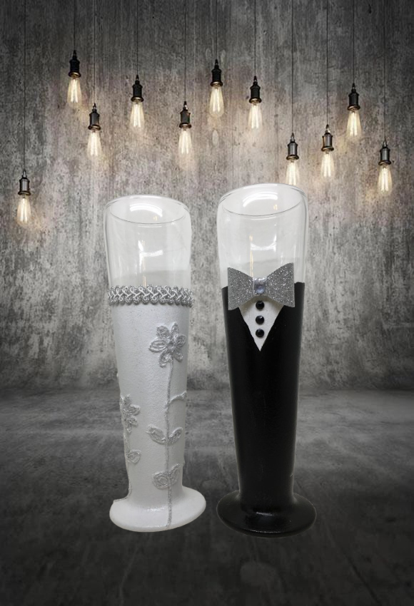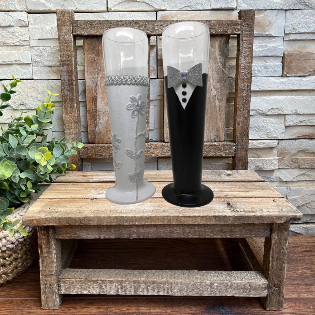 BRIDE and GROOM BEER Toasting Glasses WEDDING Hand Painted Black and White With Bling, Lace, and Silver Glitter Tie