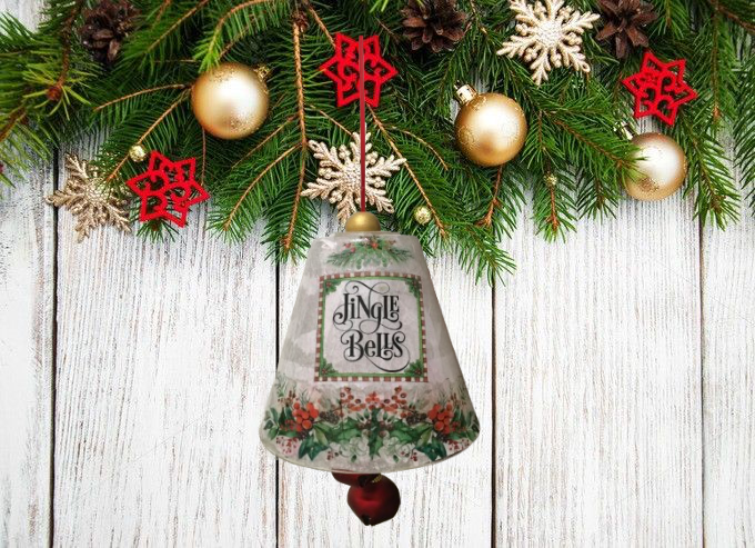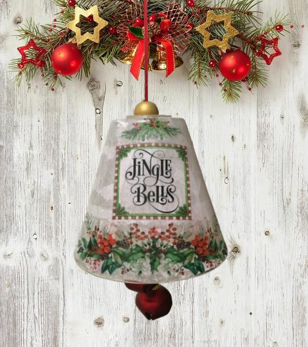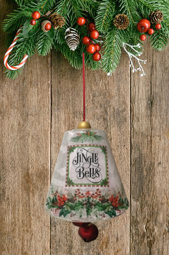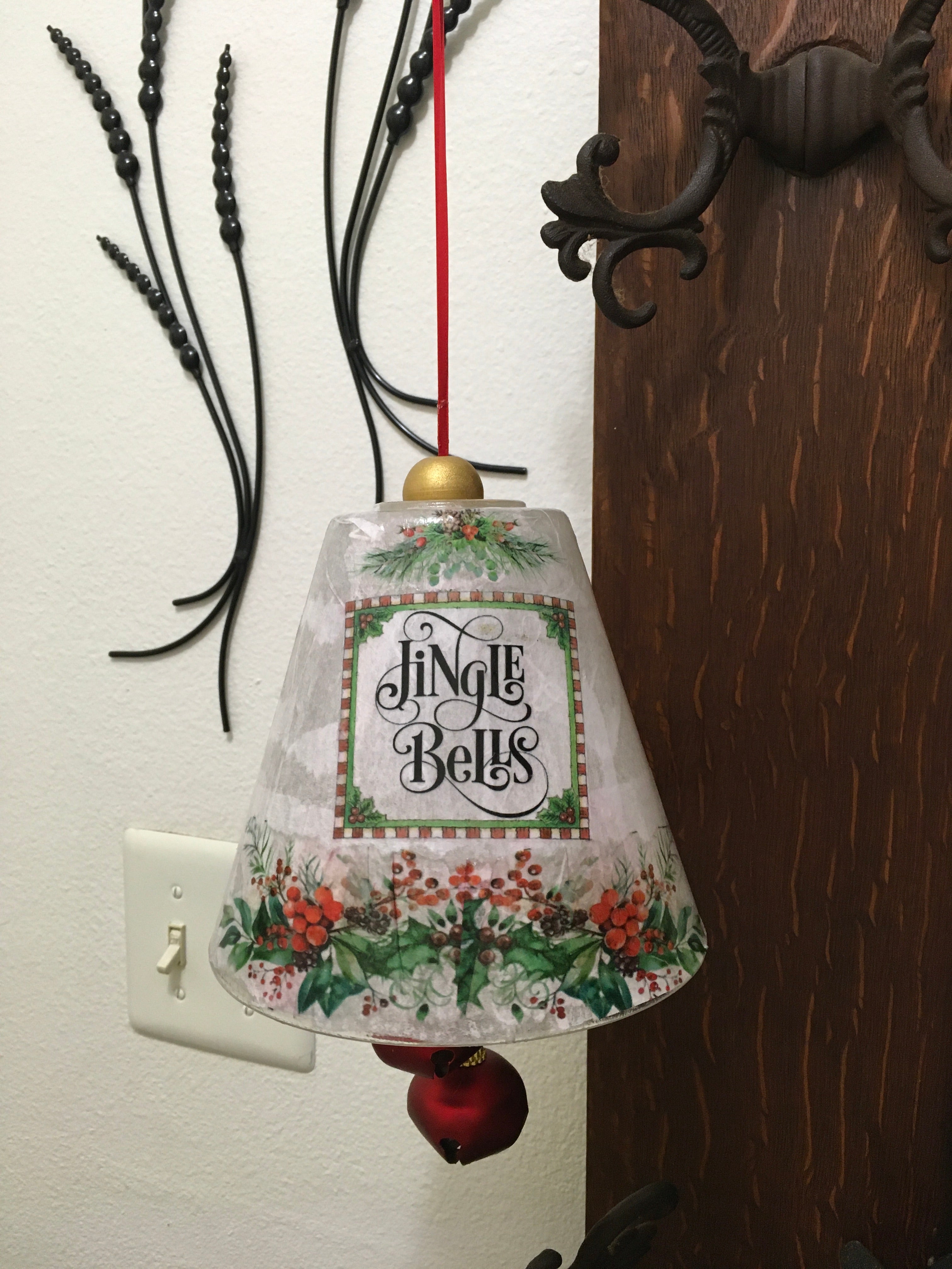 Glass BELL Decoupaged JINGLE BELLS Christmas Holiday Decor Upcycled Repurposed Light Globes Shelf Sitter Shabby Chic Victorian BoHo Decor Gift Idea - JAMsCraftCloset