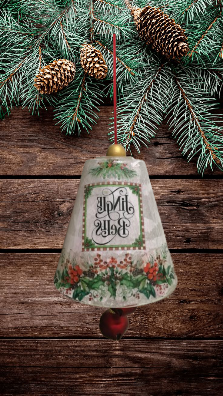 Glass BELL Decoupaged JINGLE BELLS Christmas Holiday Decor Upcycled Repurposed Light Globes Shelf Sitter Shabby Chic Victorian BoHo Decor Gift Idea