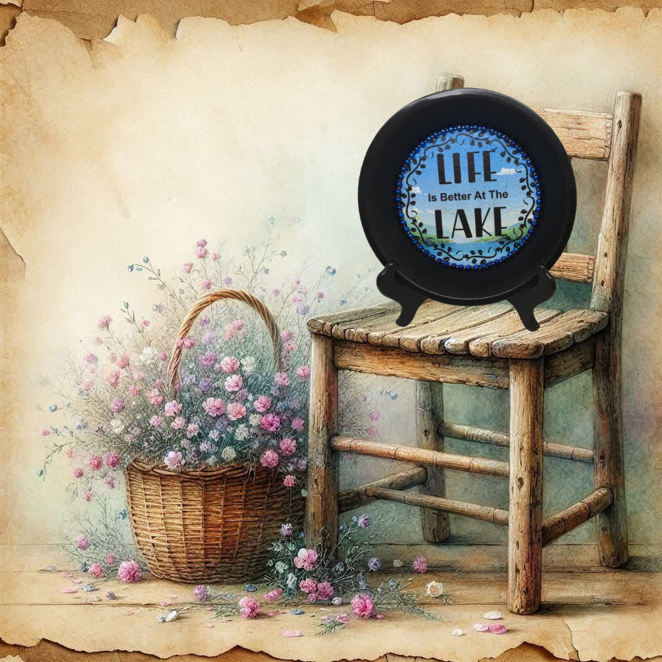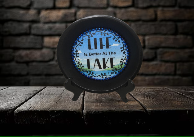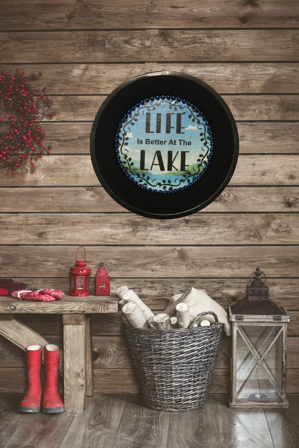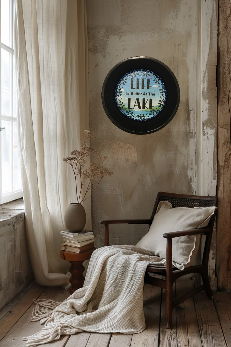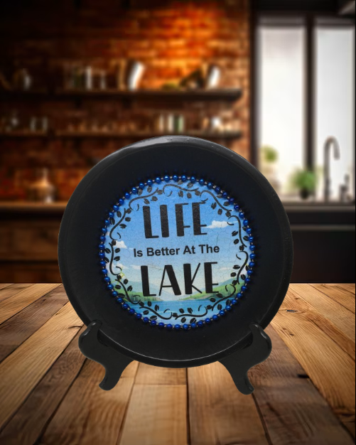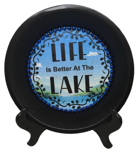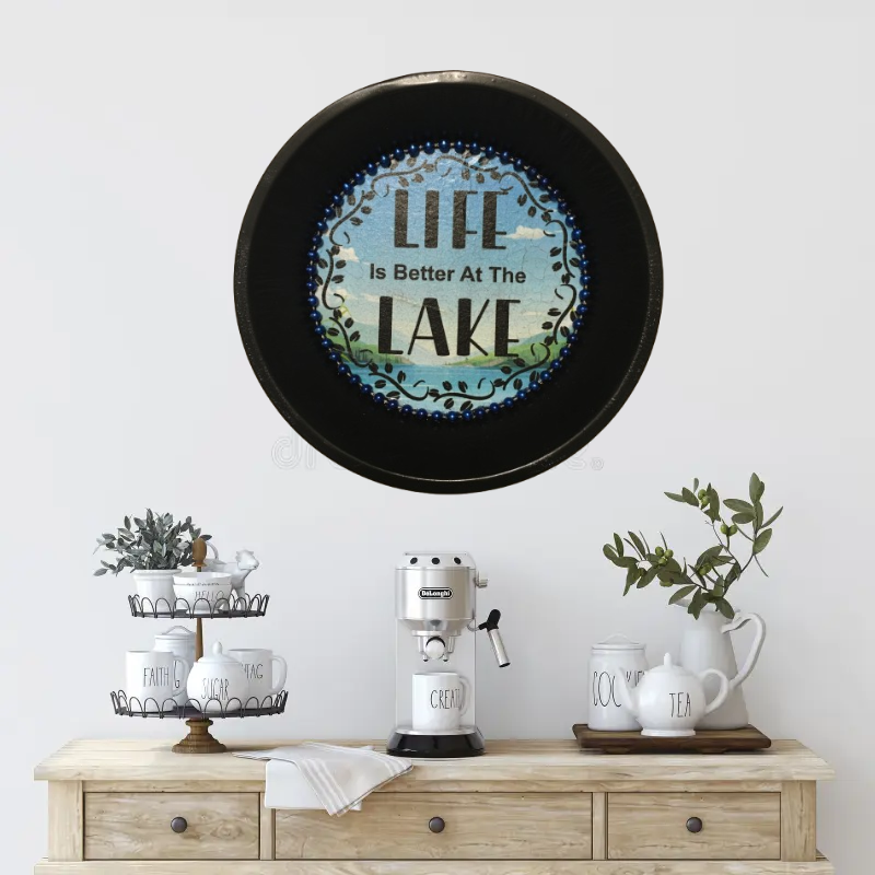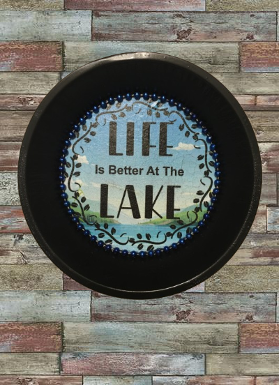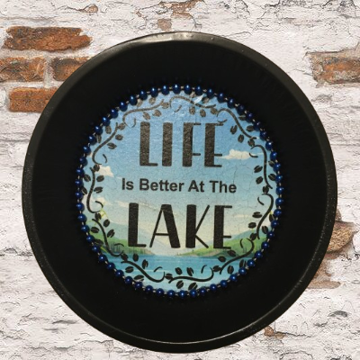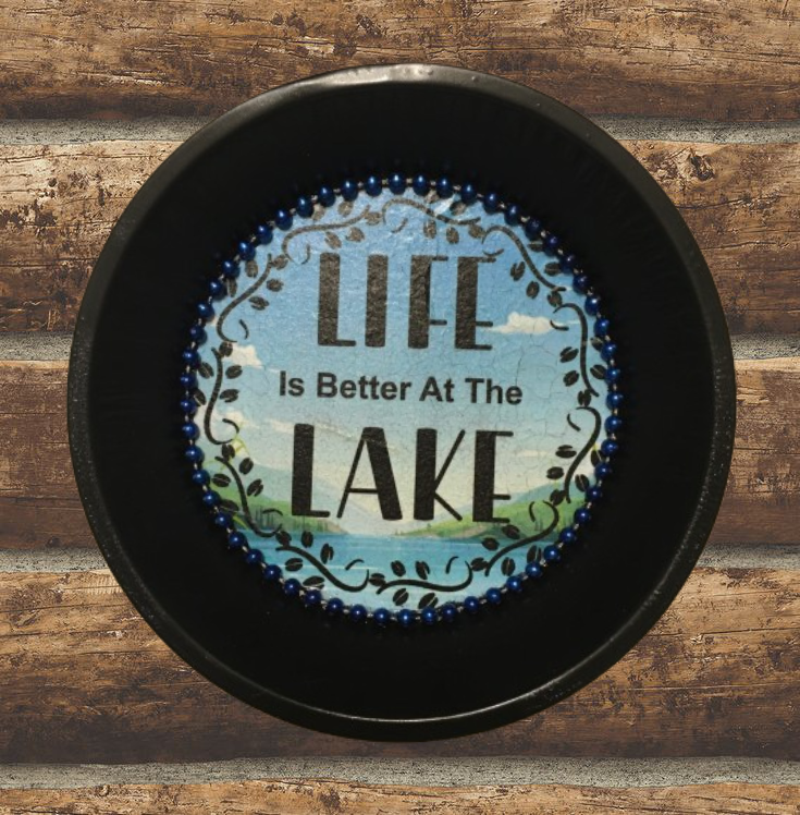 Pie Pan Metal Enamel Vintage Black LIFE IS BETTER AT THE LAKE Farmhouse Lake House Country Wall Art Handmade Decoupaged Hand Painted Repurposed Upcycled Gift Idea - JAMsCraftCloset