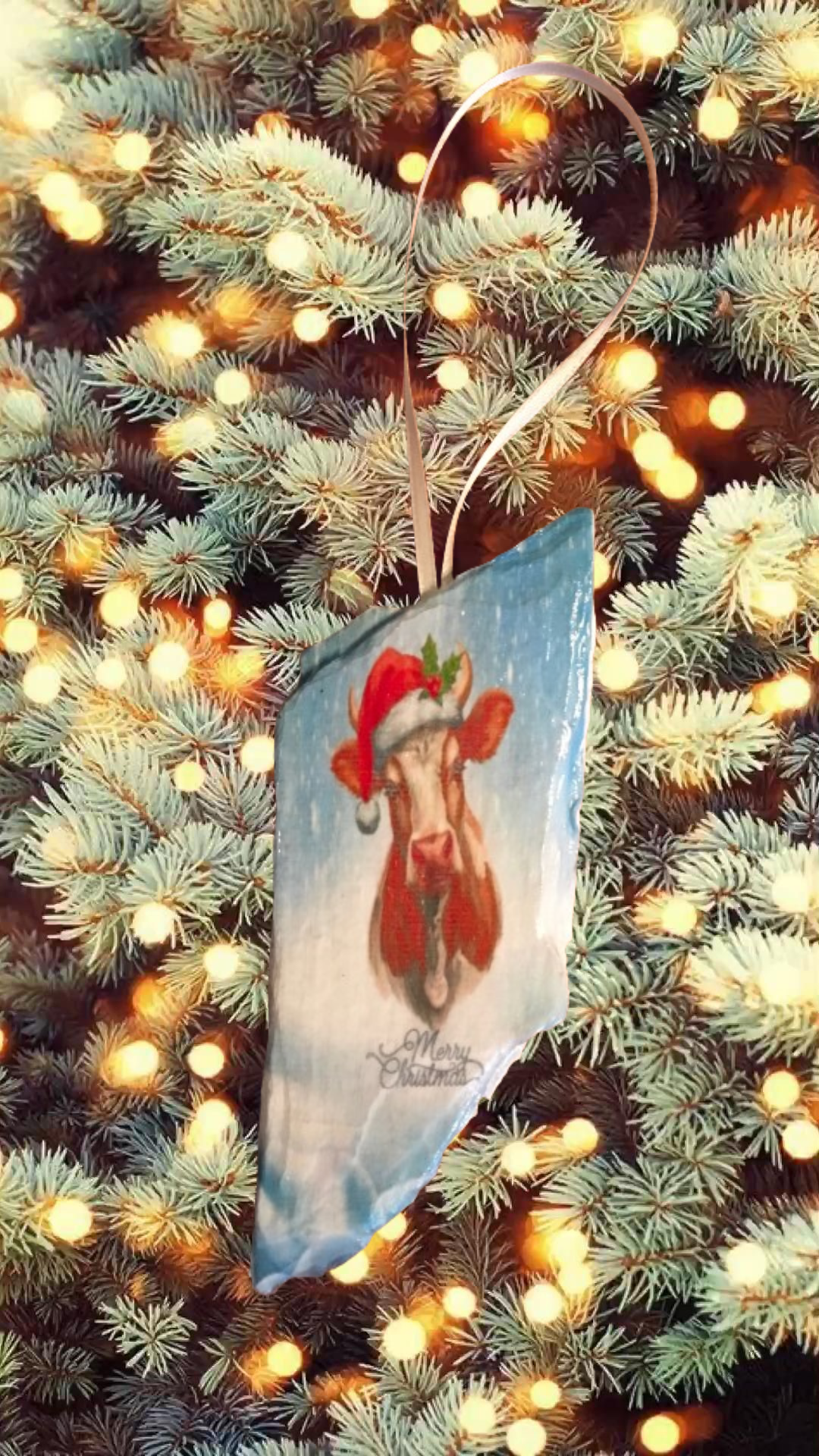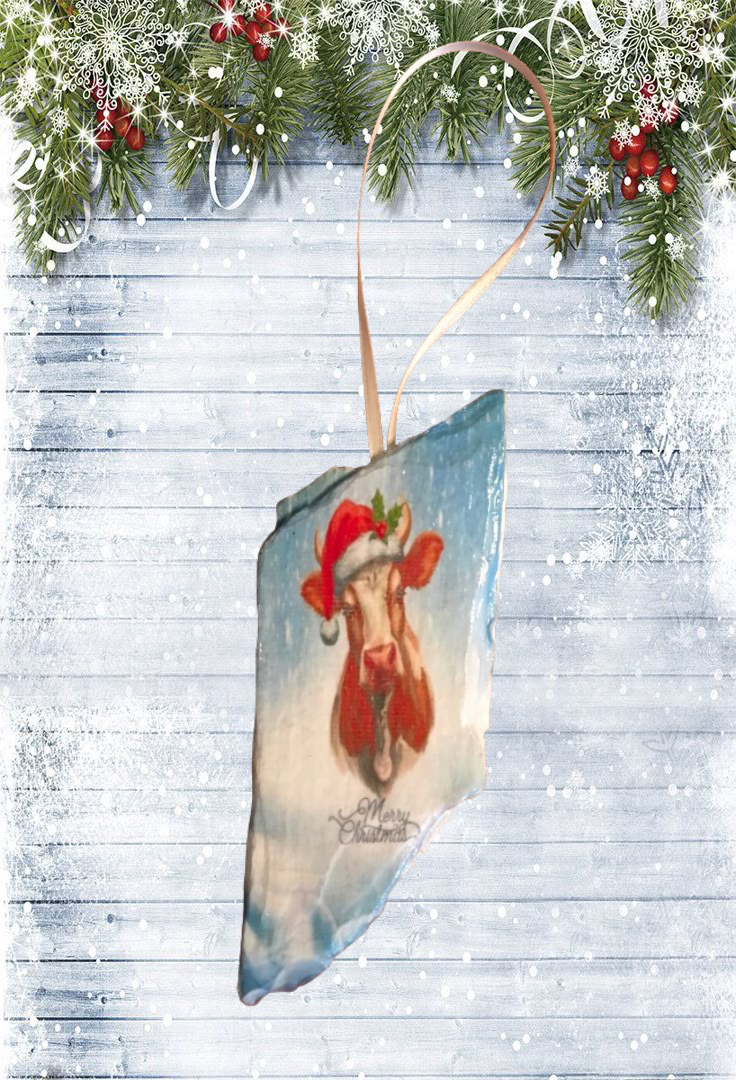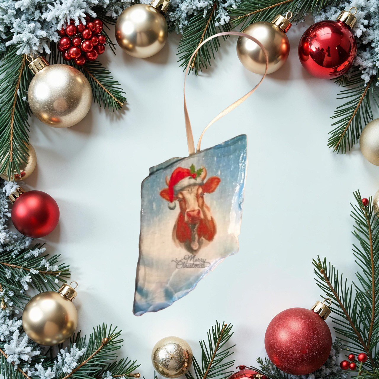Antique West Virginia Roof Decoupaged Christmas Ornament - COW WITH HAT MERRY CHRISTMAS - Handmade Holiday Tree Decor Unique Country Farmhouse House Decor Gift