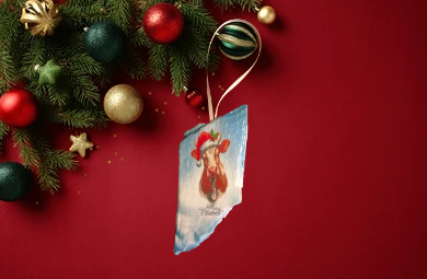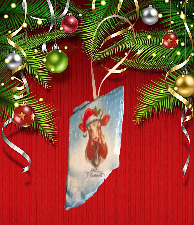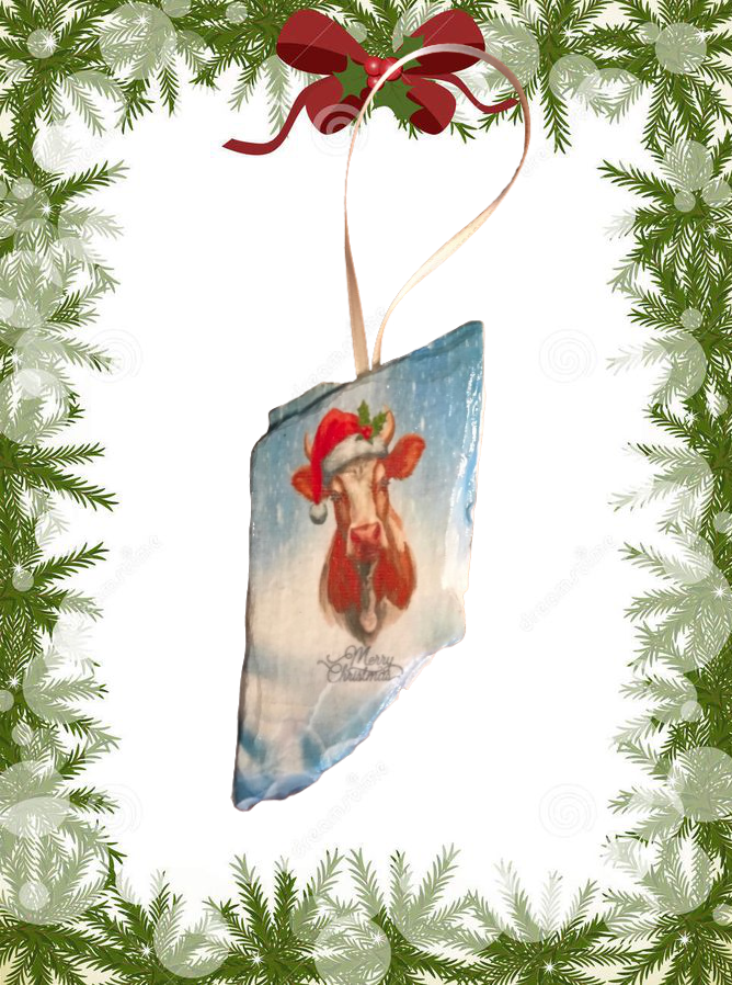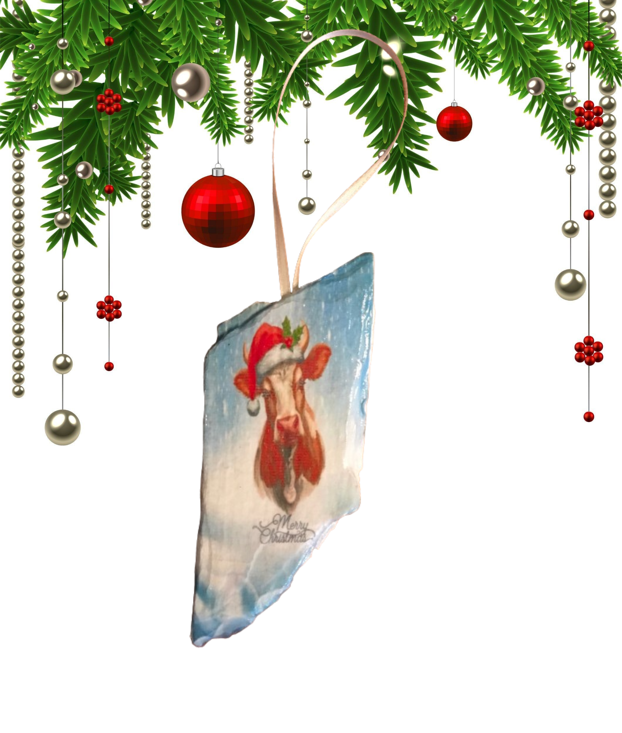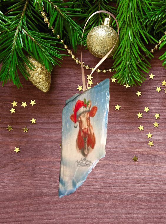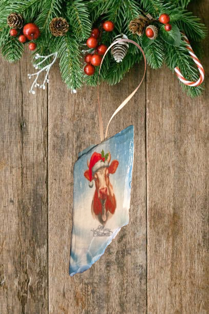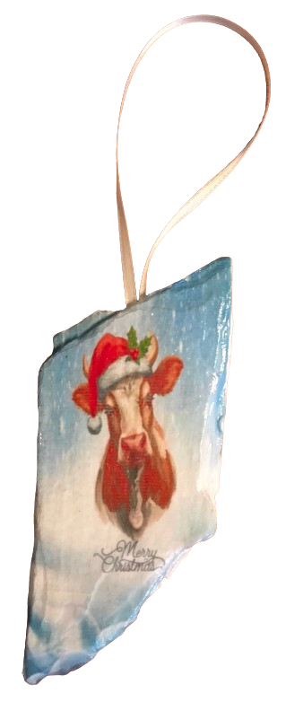 Antique West Virginia Roof Decoupaged Christmas Ornament - COW WITH HAT MERRY CHRISTMAS - Handmade Holiday Tree Decor Unique Country Farmhouse House Decor Gift