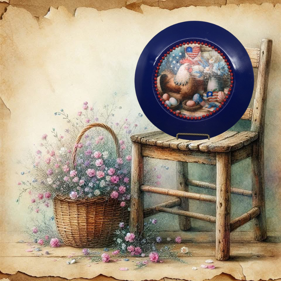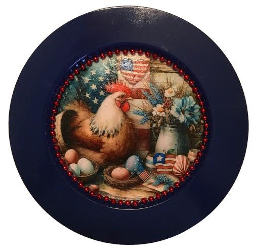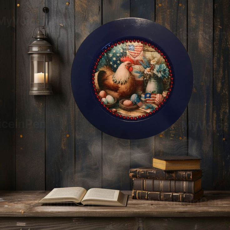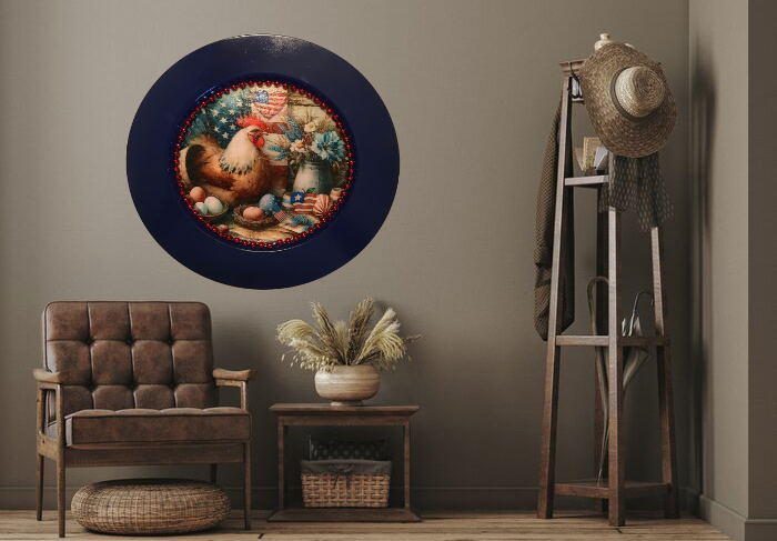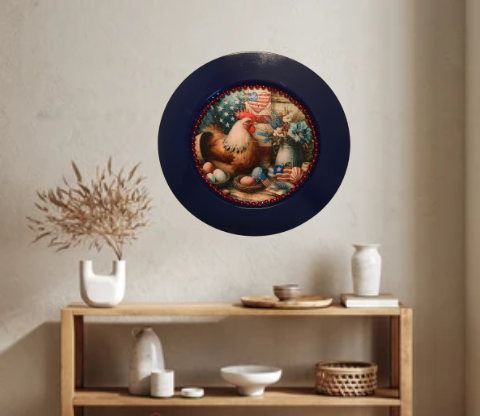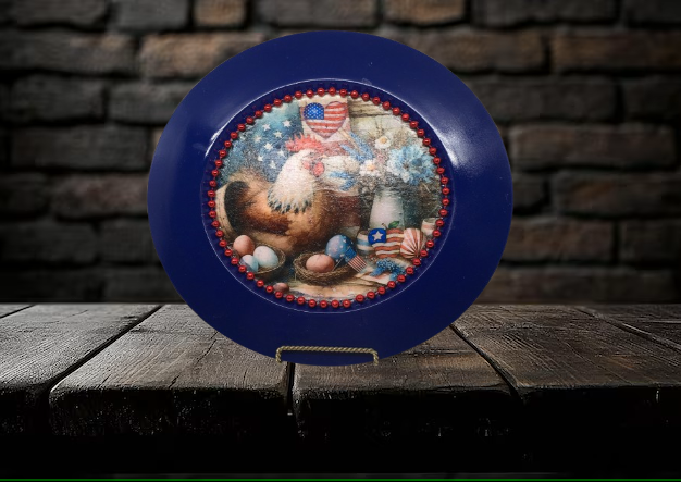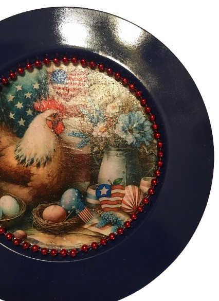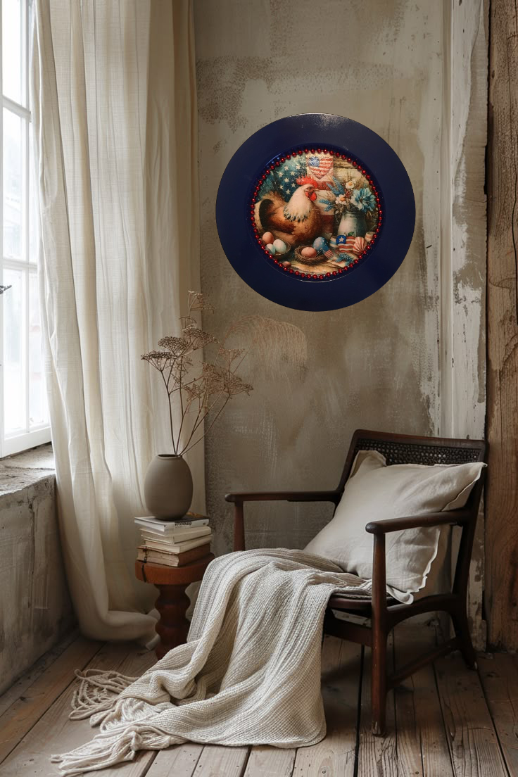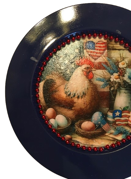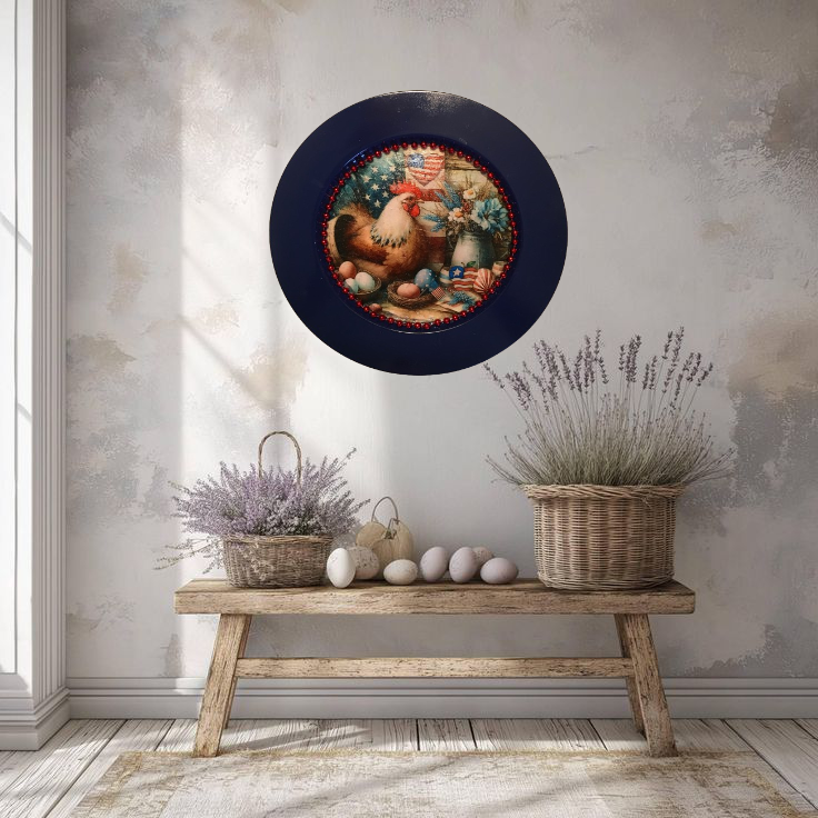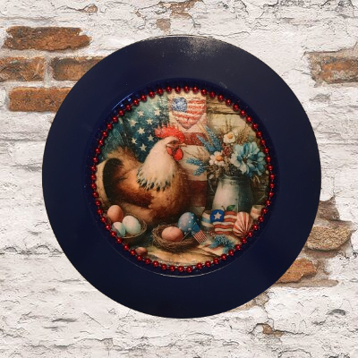 PLATE CHARGER NAVY BLUE PLASTIC ROUND DECOUPAGED Upcycled Repurposed Wall Art or Shelf Sitter HEN WITH EGGS 4TH OF JULY Decor Kitchen Decor Home Decor Wall Art Gift WEDDING