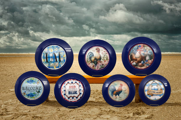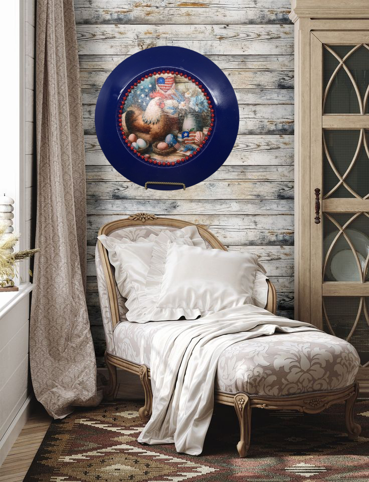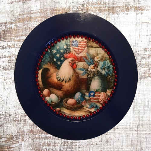 PLATE CHARGER NAVY BLUE PLASTIC ROUND DECOUPAGED Upcycled Repurposed Wall Art or Shelf Sitter HEN WITH EGGS 4TH OF JULY Decor Kitchen Decor Home Decor Wall Art Gift WEDDING - JAMsCraftCloset