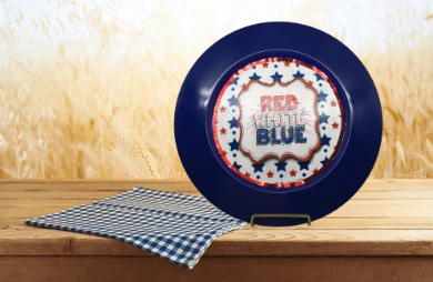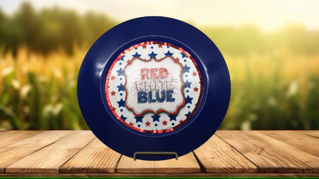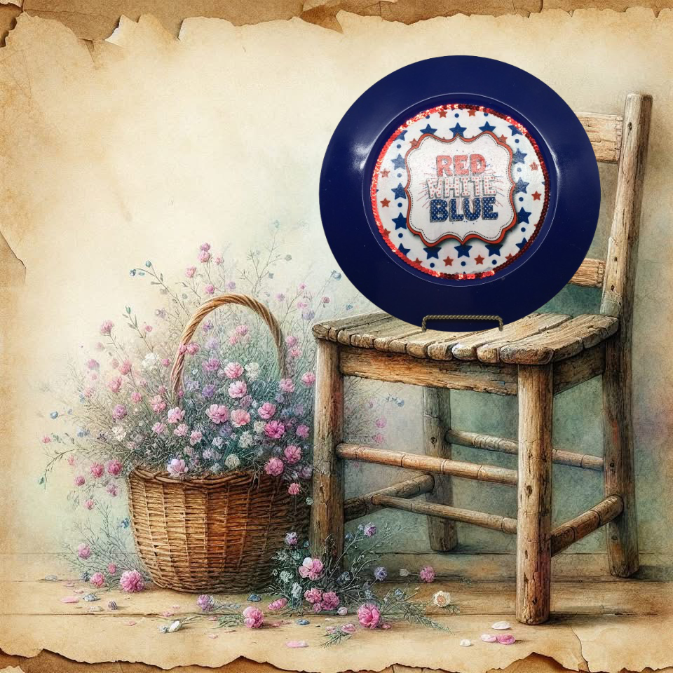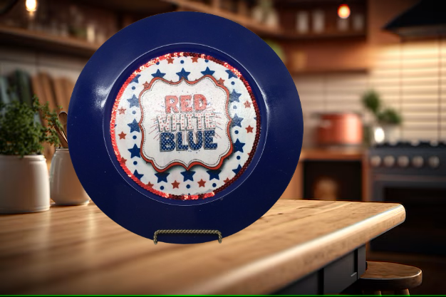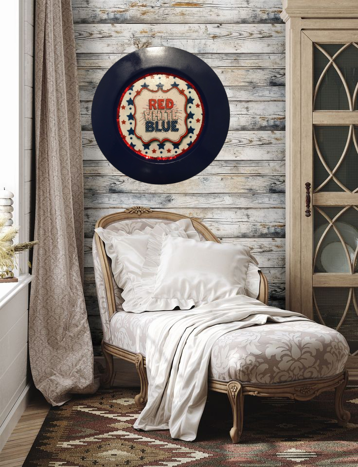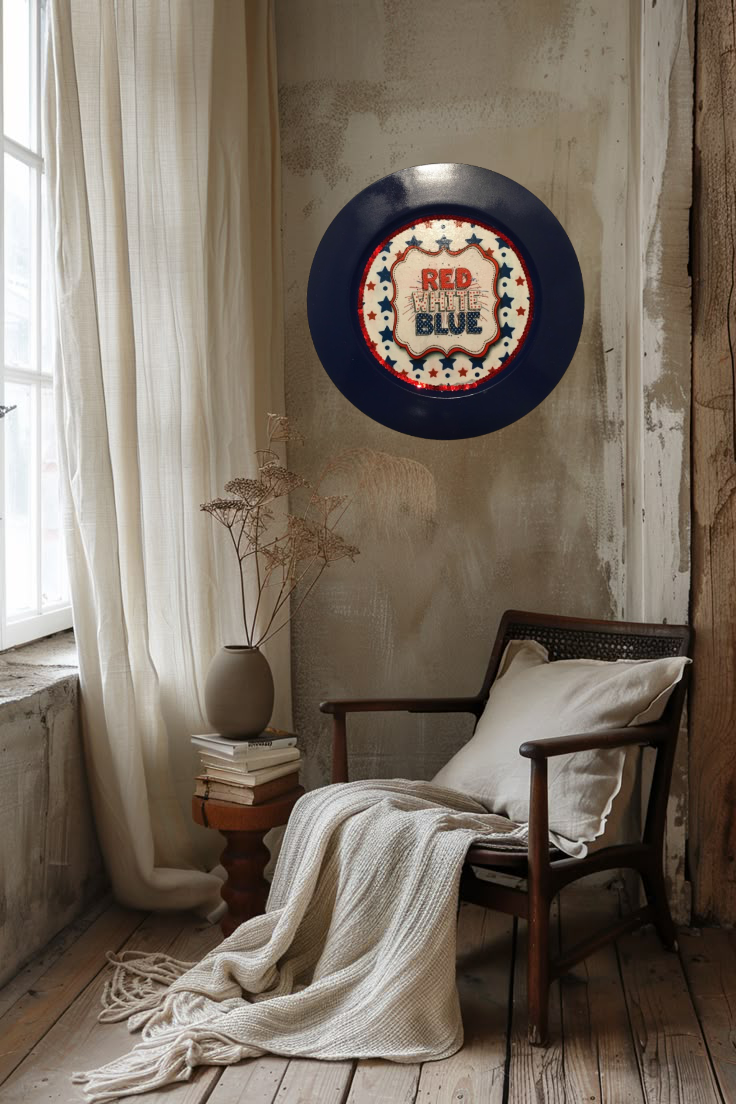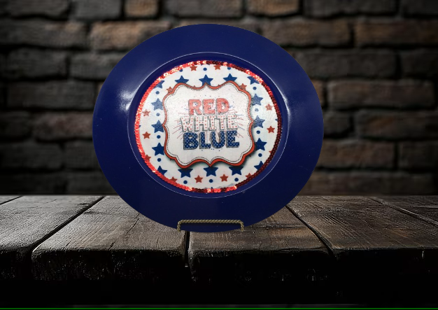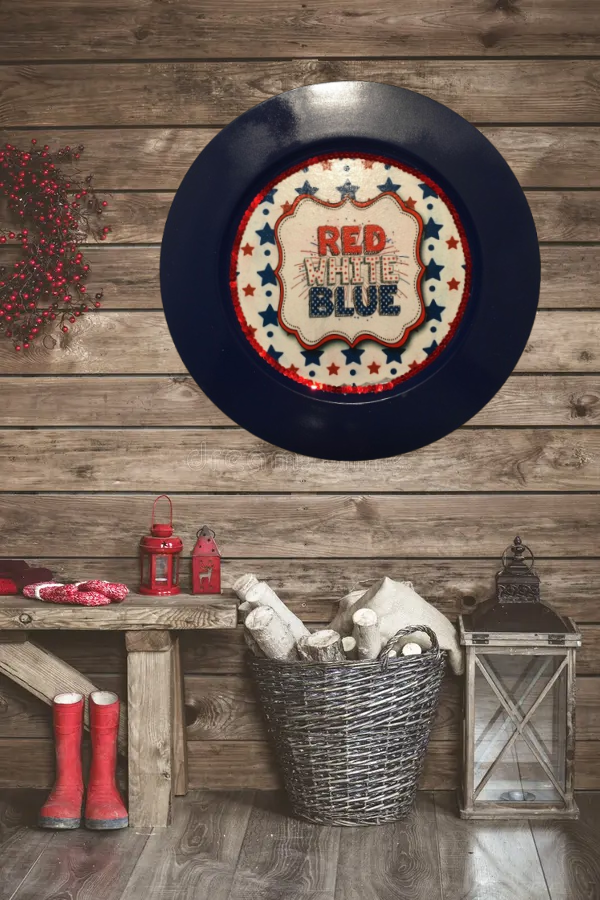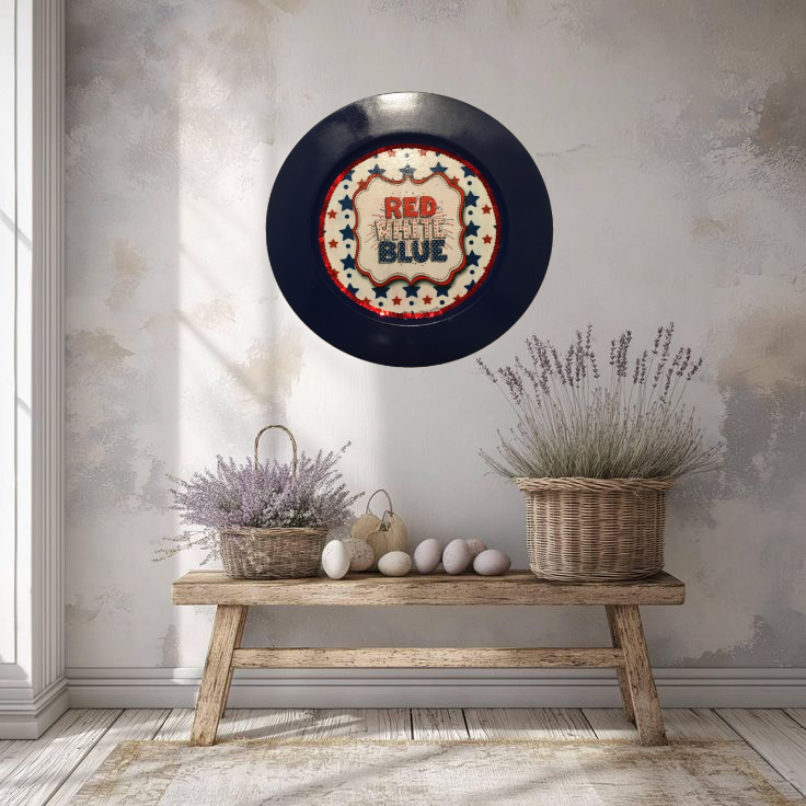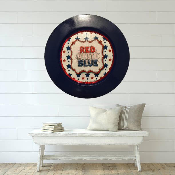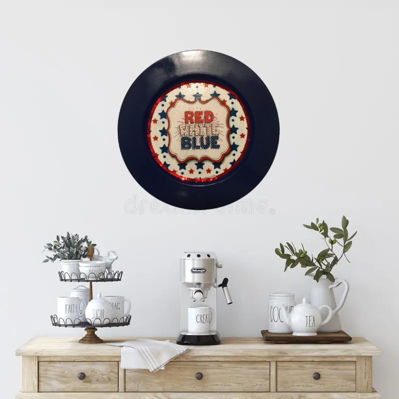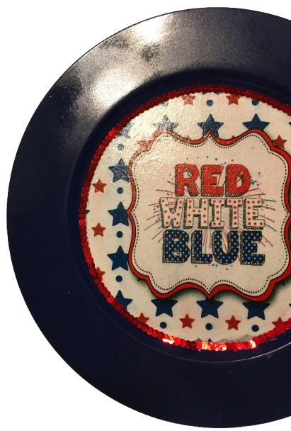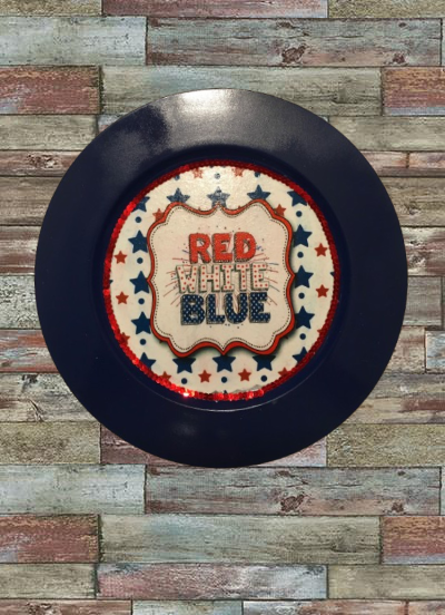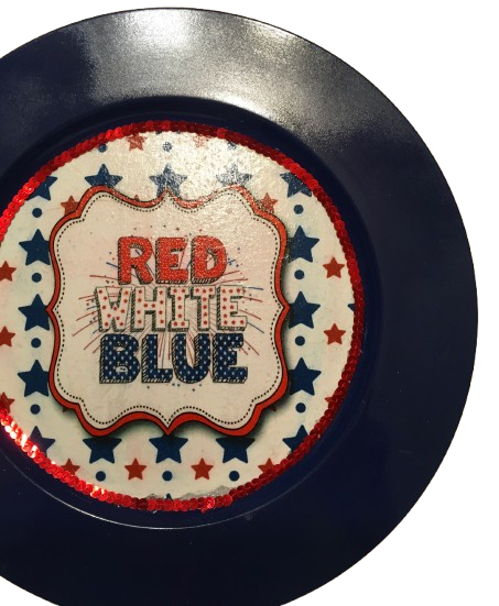 PLATE CHARGER NAVY BLUE PLASTIC ROUND DECOUPAGED Upcycled Repurposed Wall Art or Shelf Sitter RED WHITE BLUE 4TH OF JULY Decor Kitchen Decor Home Decor Wall Art Gift WEDDING