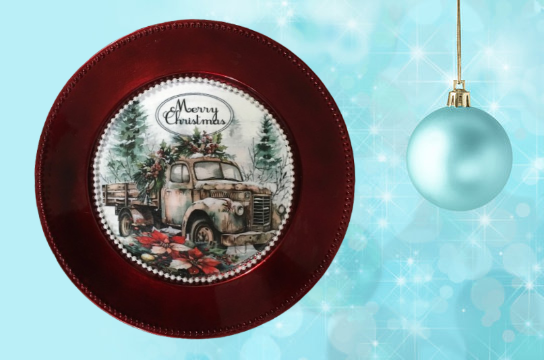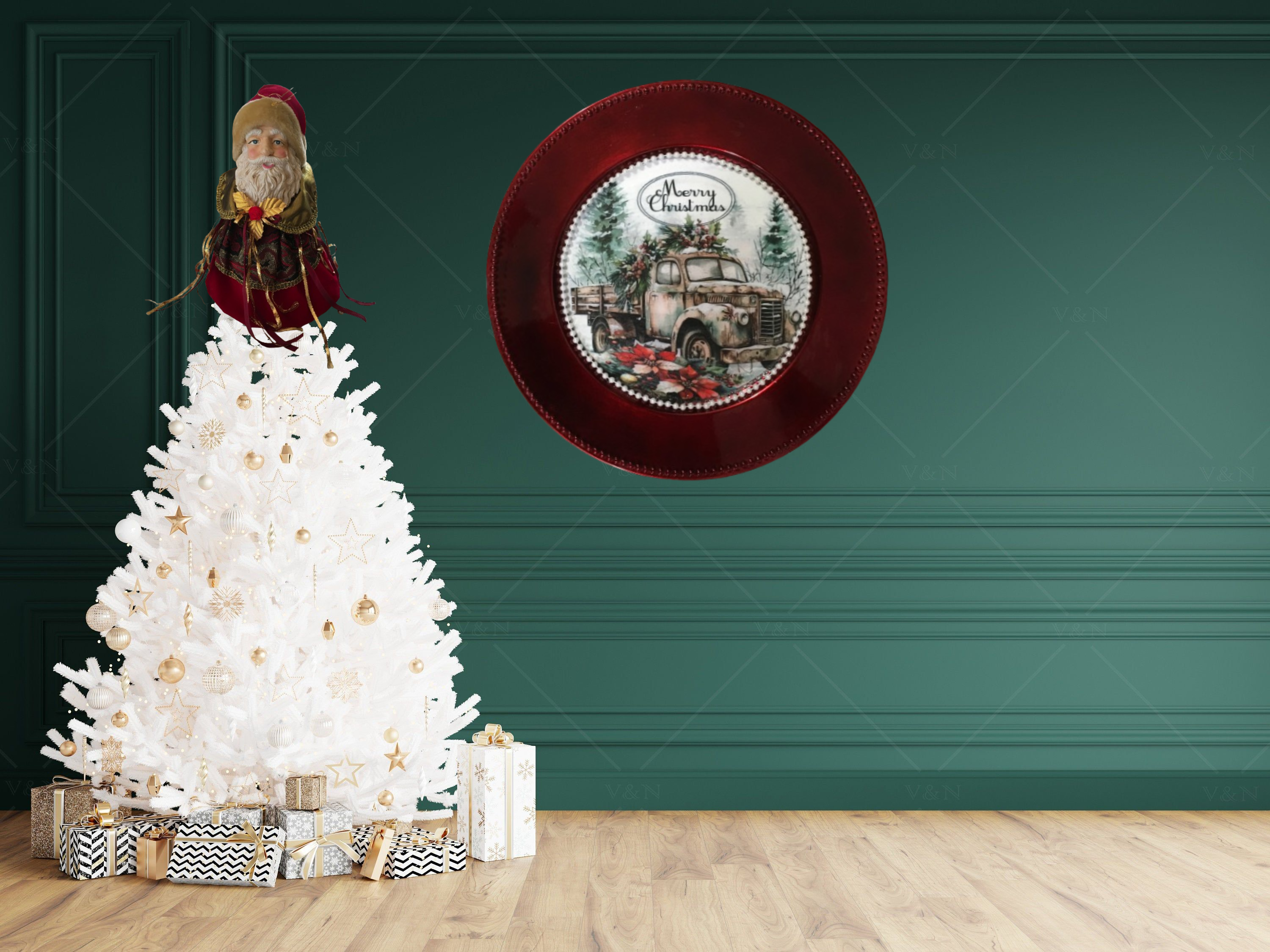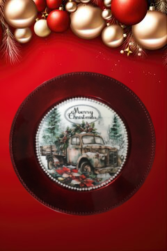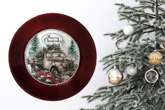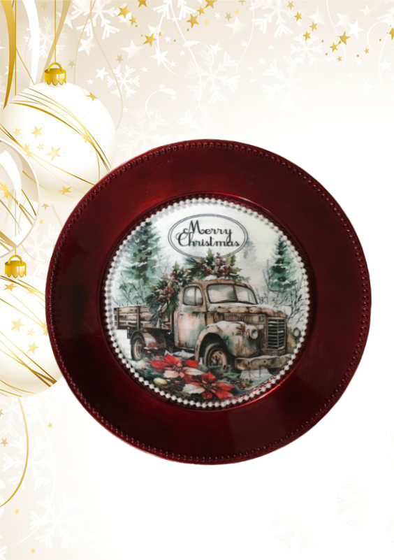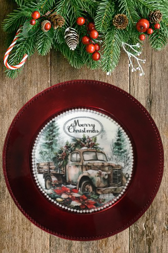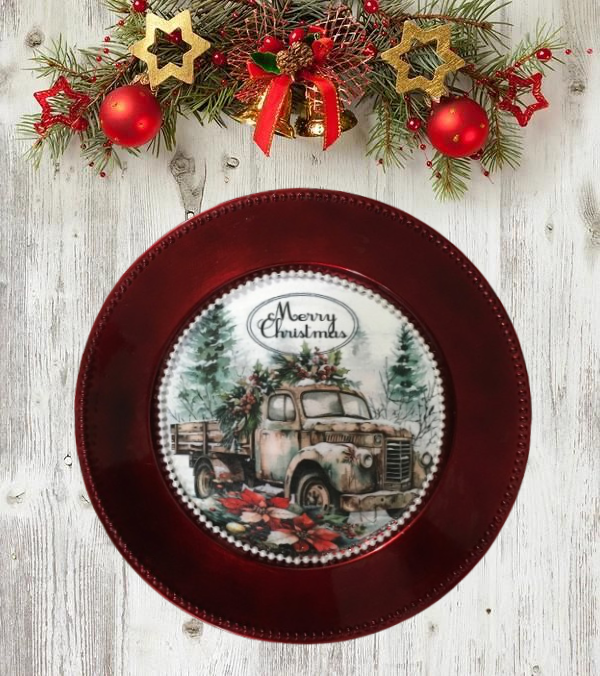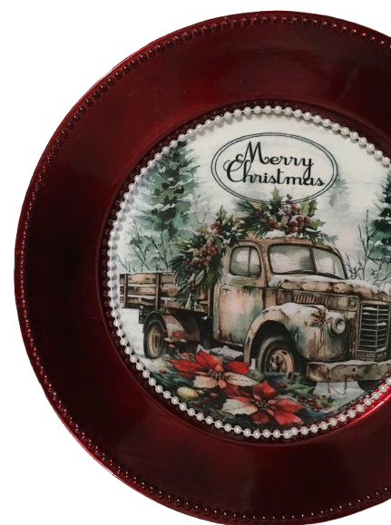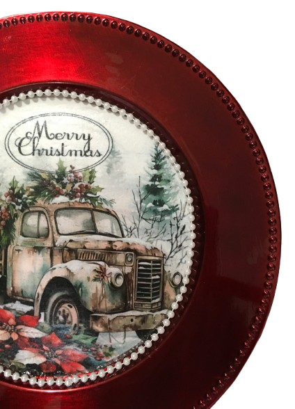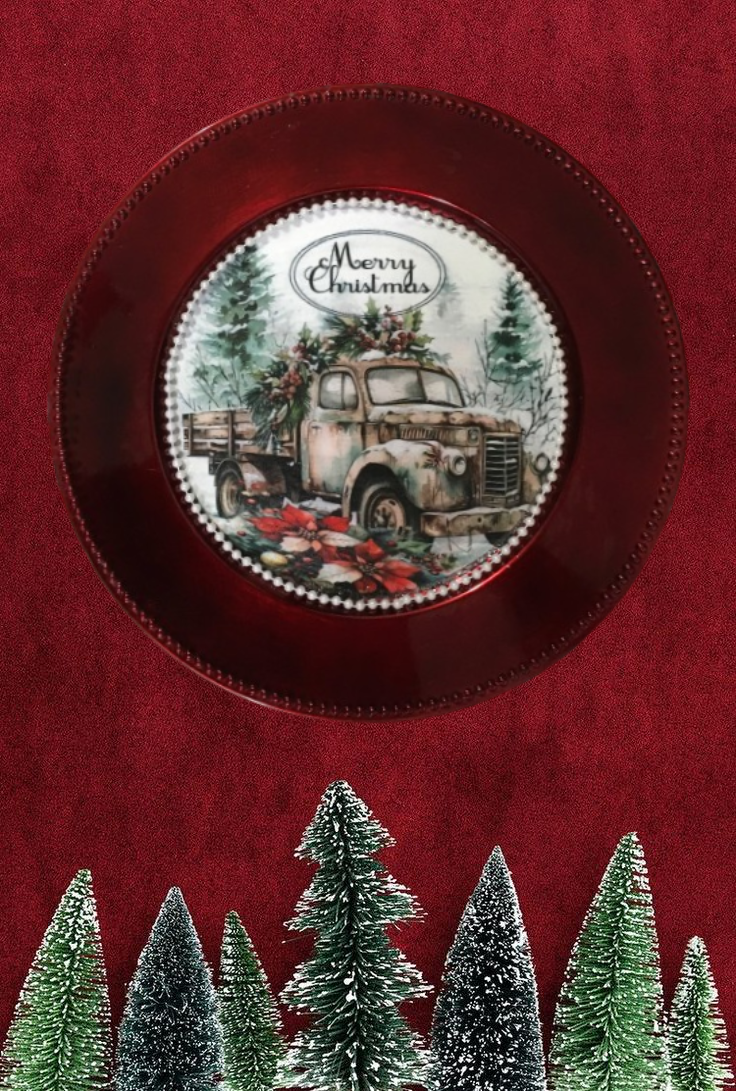 Ruby Red CHARGER PLATE Christmas Holiday Wall Art OLD TRUCK MERRY CHRISTMAS Country Farmhouse Home Holiday Decor Handmade Decoupaged Gift Idea Crafters Delight