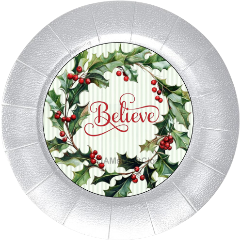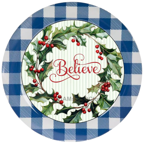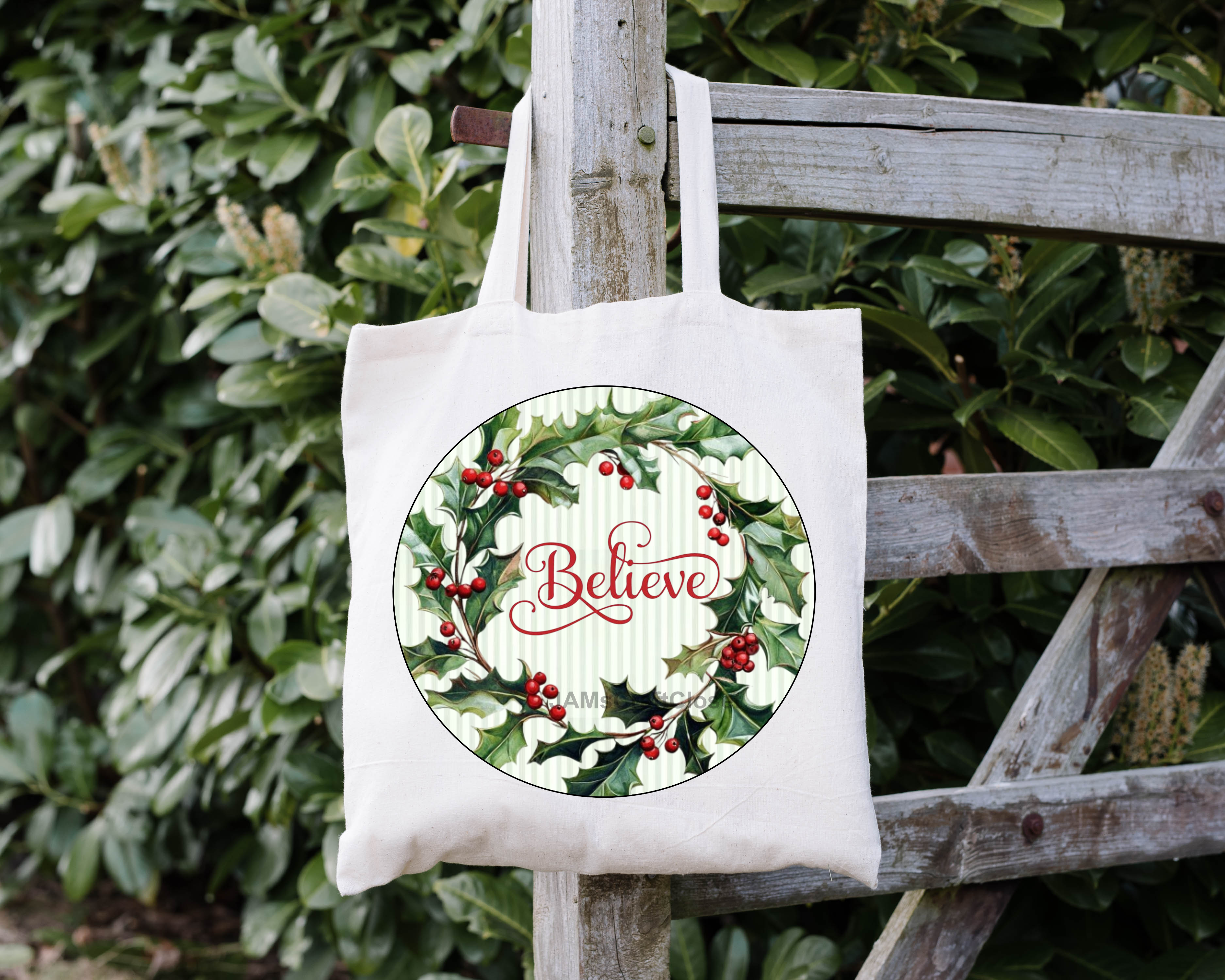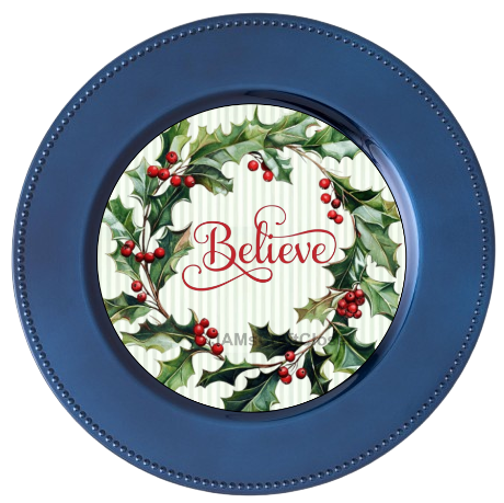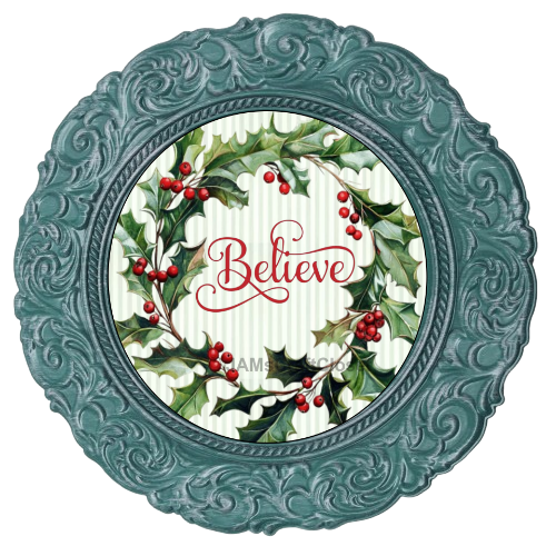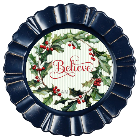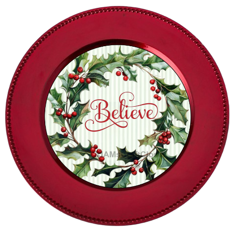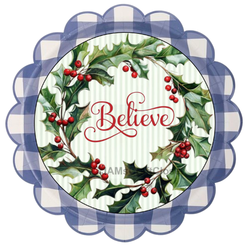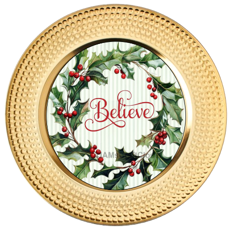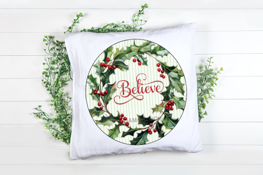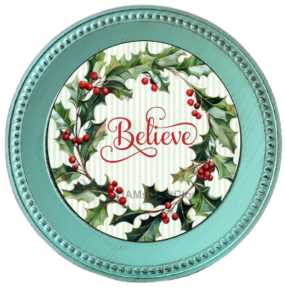 ROUND Digital Graphic Design BELIEVE Holly Berries Yellow Background - CHRISTMAS DESIGN PNG-JPEG-PDF-SVG-Decoupage-Sublimation Design Graphic Country Farmhouse Home Decor HOLIDAY Decor Gift Crafters Delight