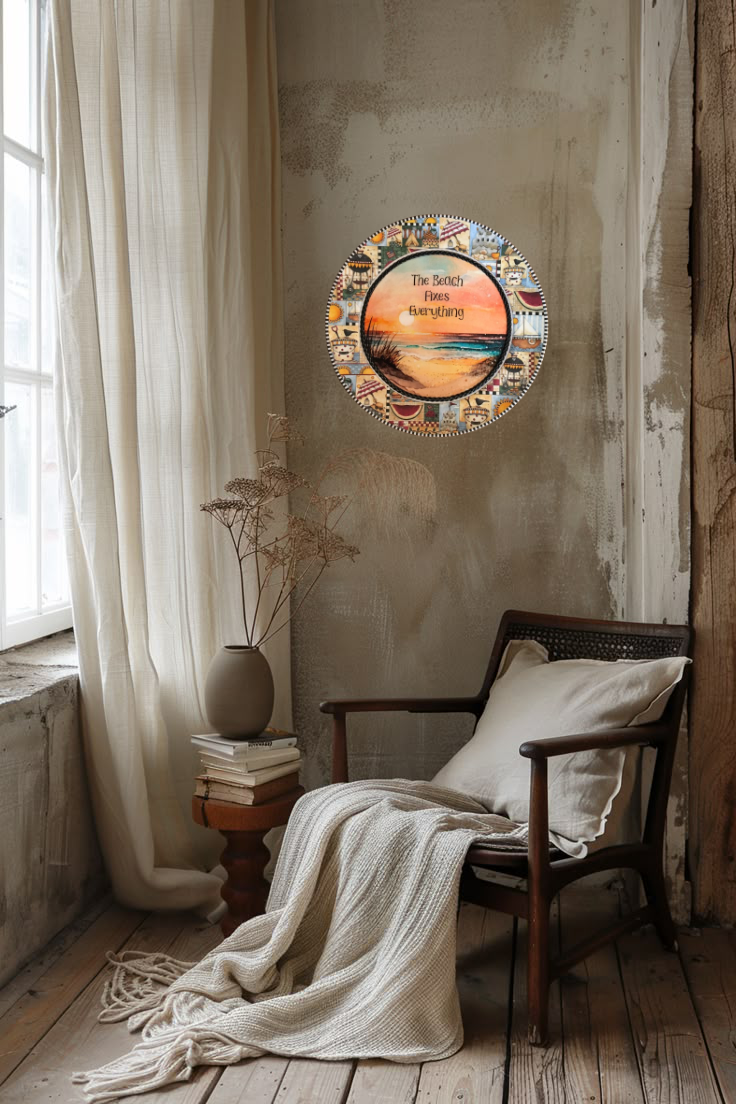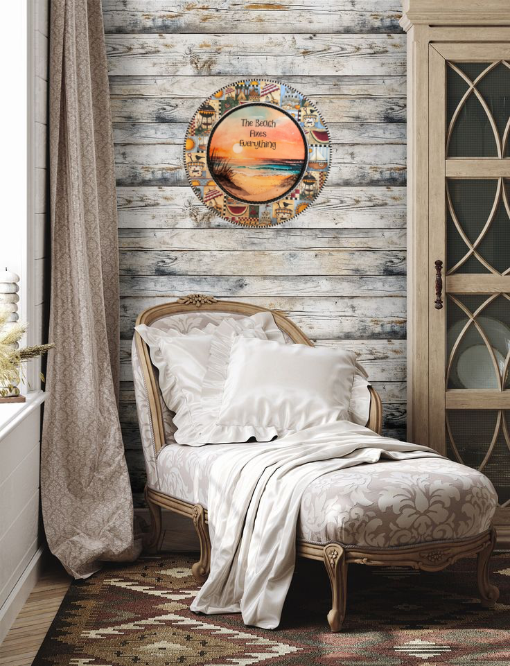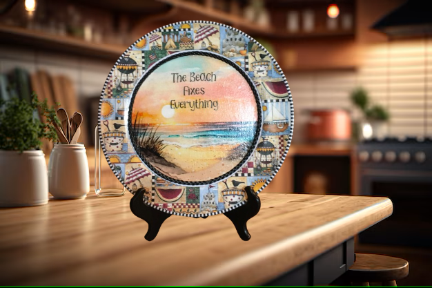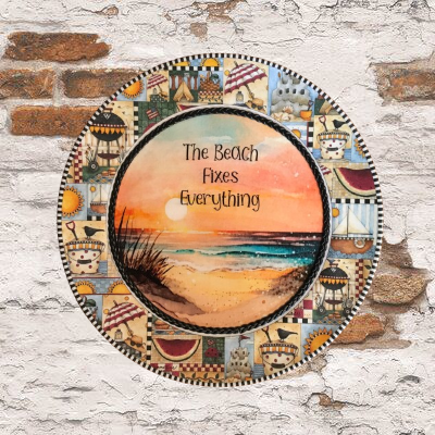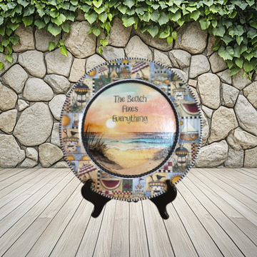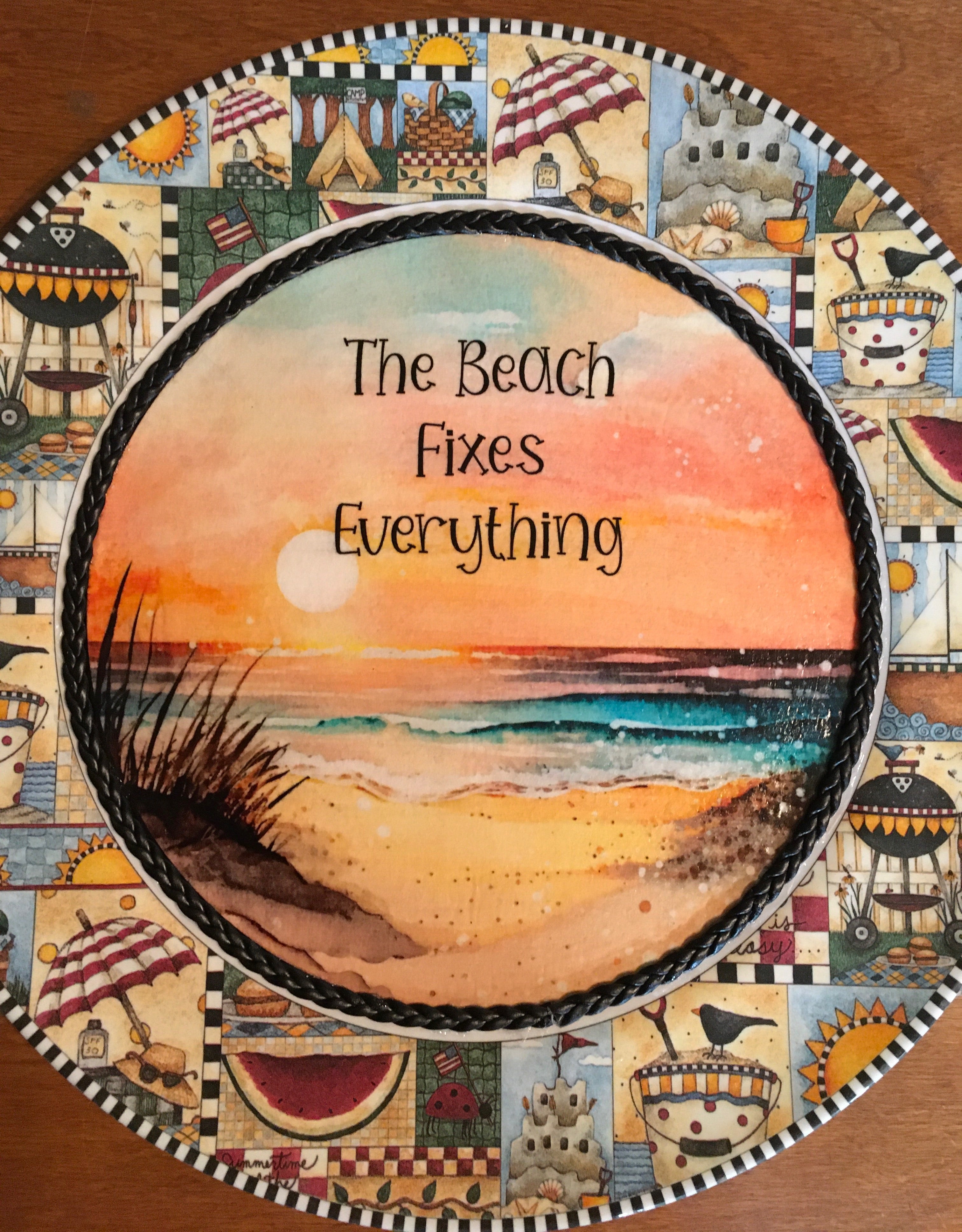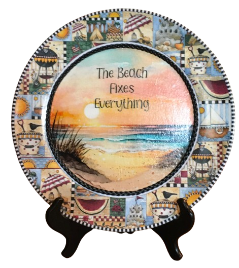 PLATE PLASTIC ROUND Beachy Border DECOUPAGED Upcycled Repurposed Wall Art or Shelf Sitter THE BEACH FIXES EVERYTHING Beach Theme Home Decor Gift - JAMsCraftCloset