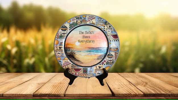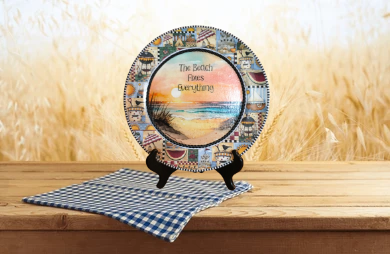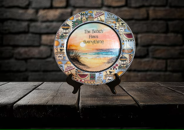PLATE PLASTIC ROUND Beachy Border DECOUPAGED Upcycled Repurposed Wall Art or Shelf Sitter THE BEACH FIXES EVERYTHING Beach Theme Home Decor Gift