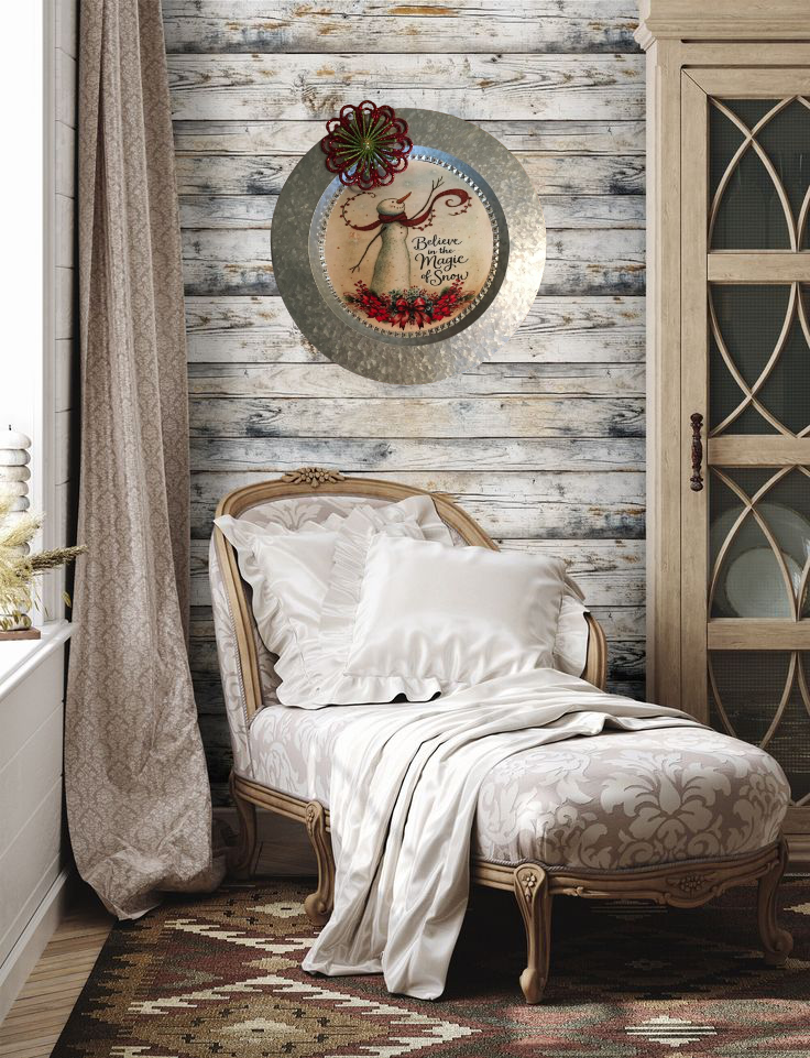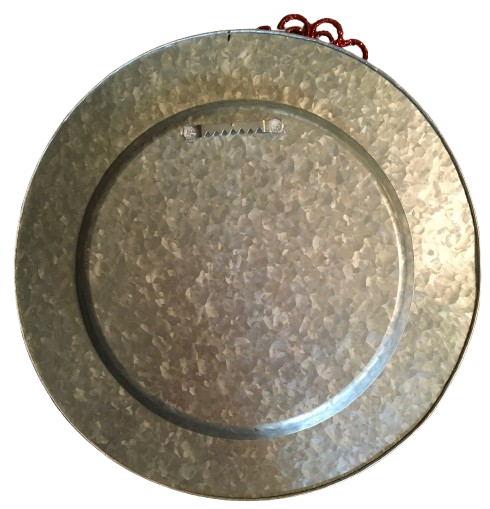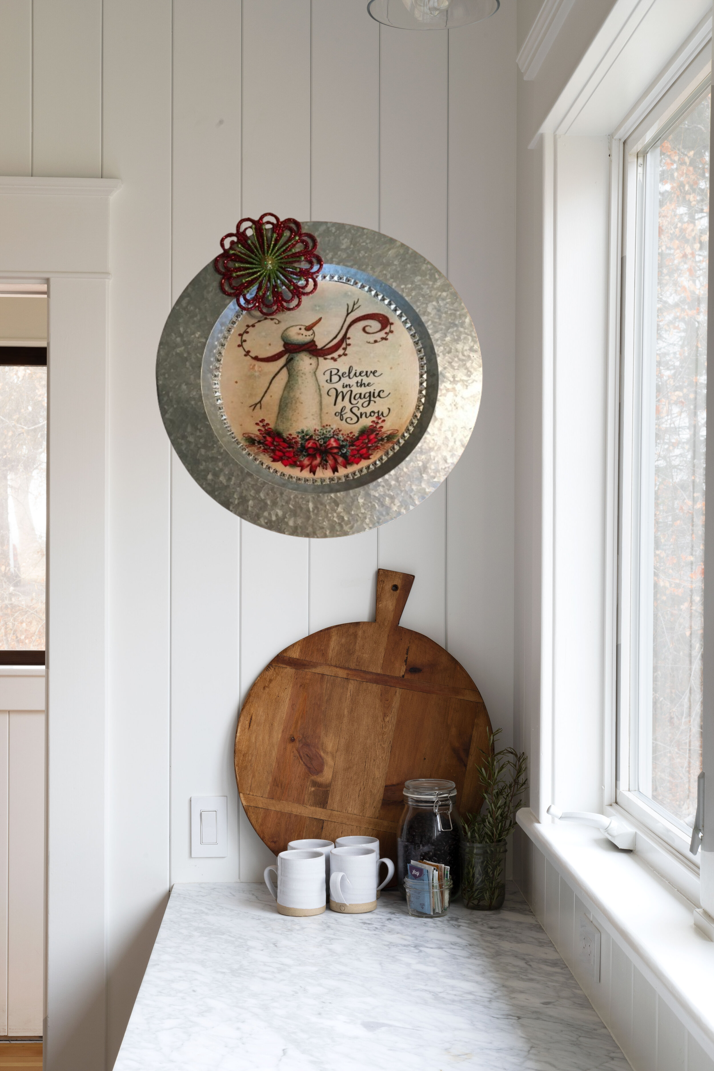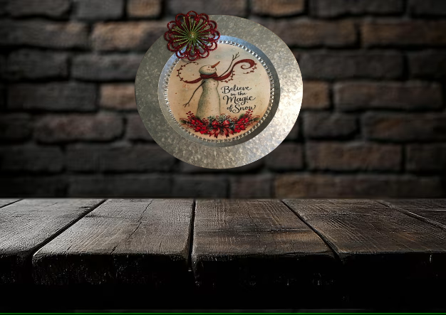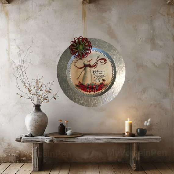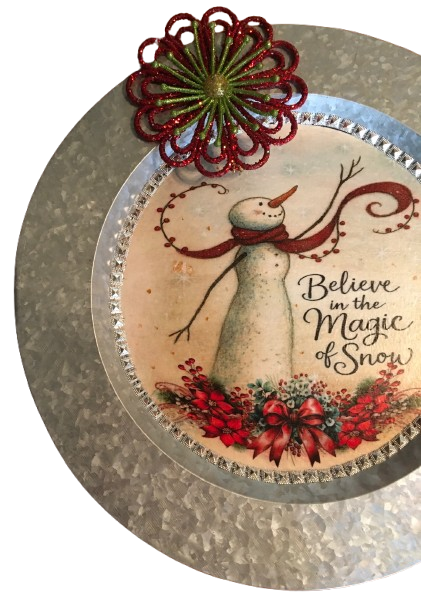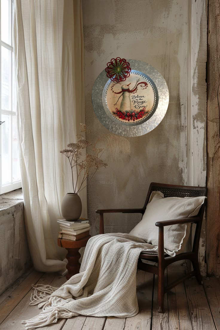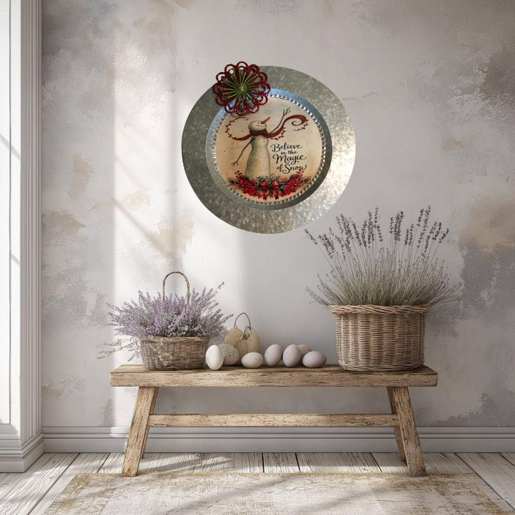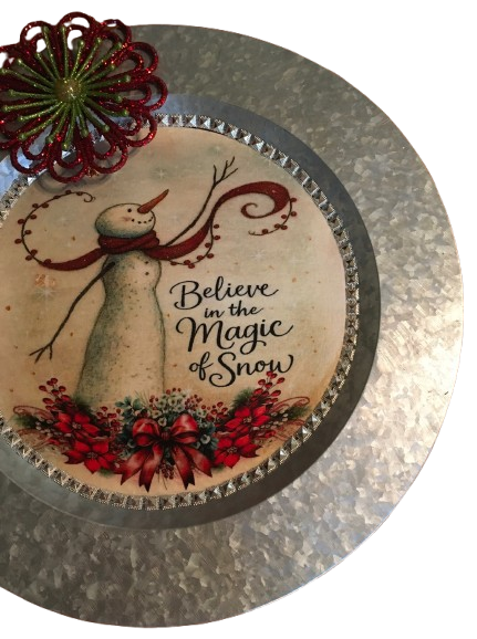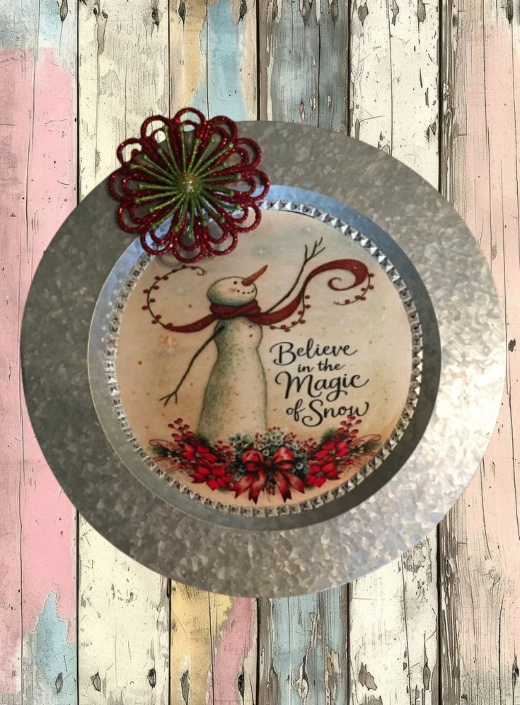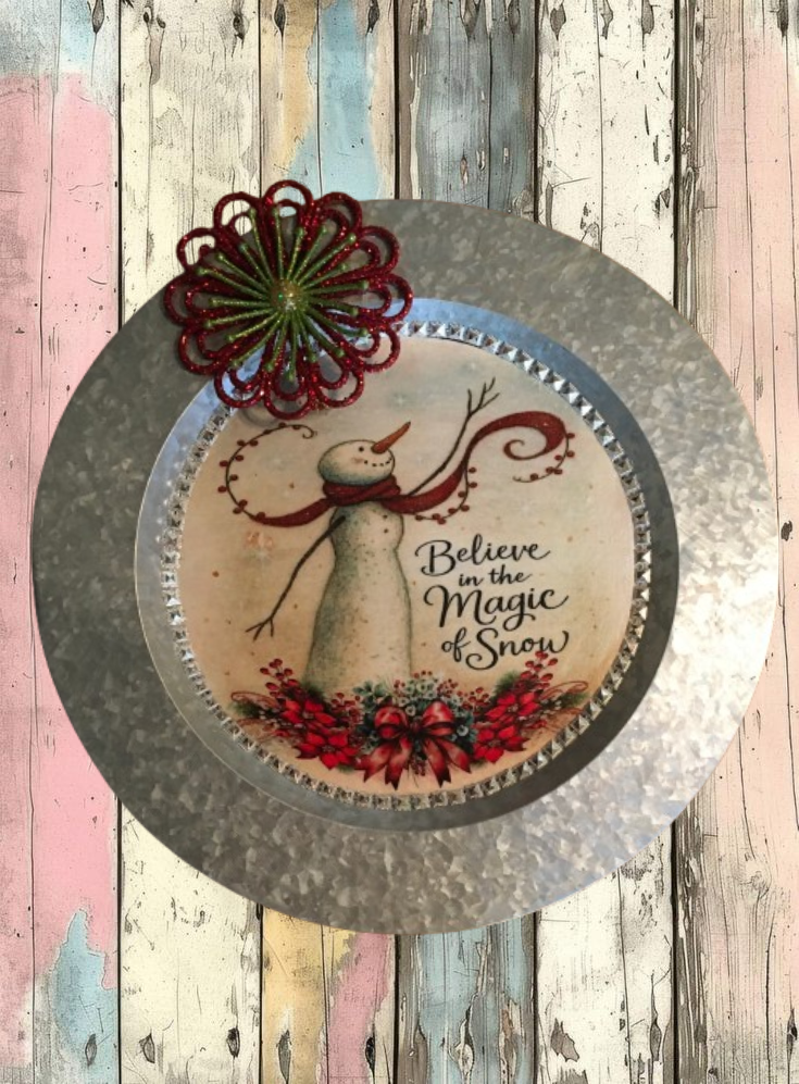 Galvanized Metal Round Charger Plate Christmas Decor Decoupaged Farmhouse Country Wall Art Shelf Sitter BELIEVE IN THE MAGIC OF SNOW Handmade Gift Idea