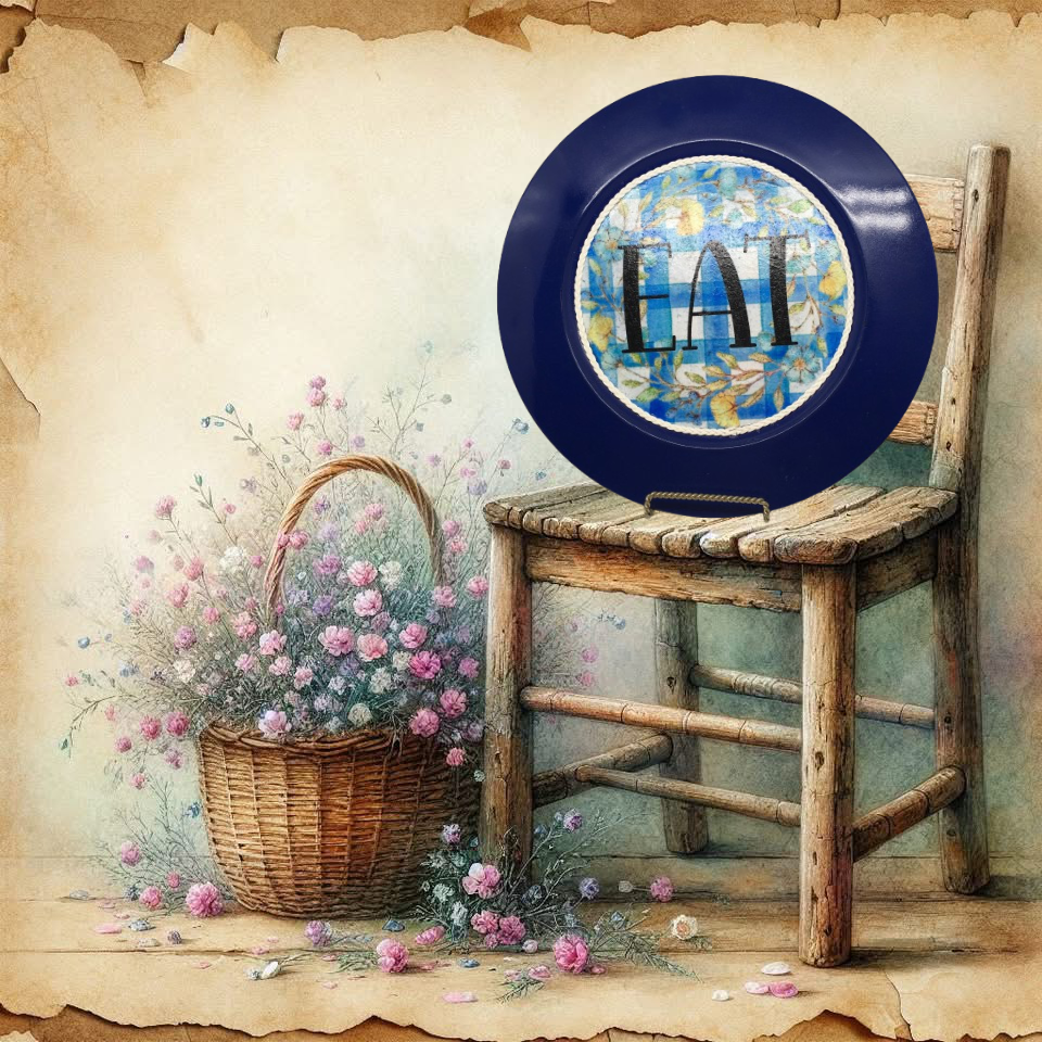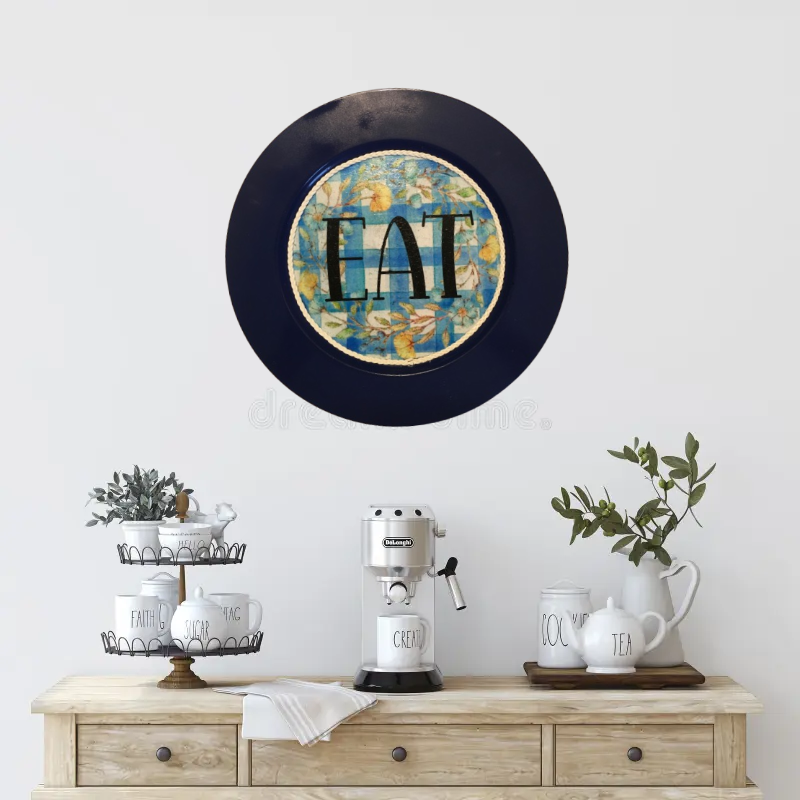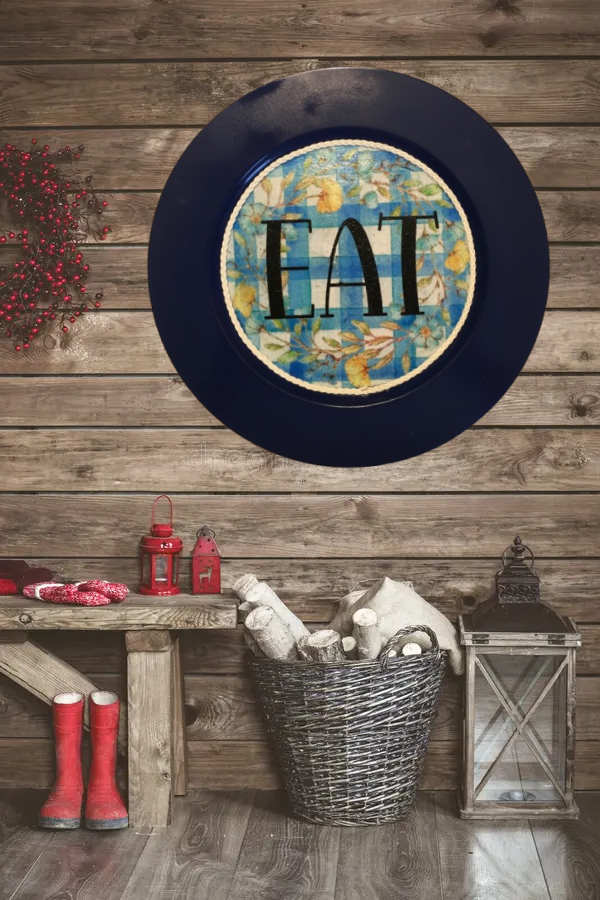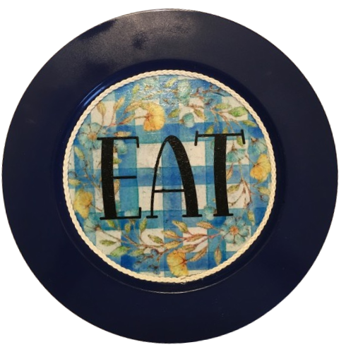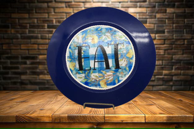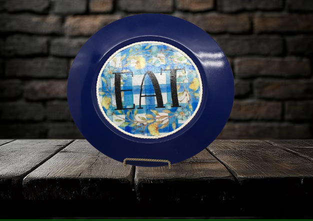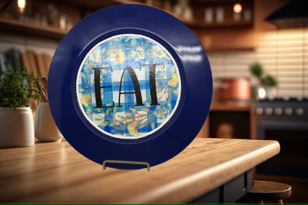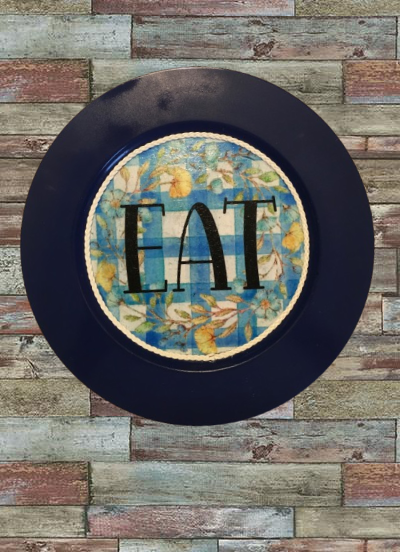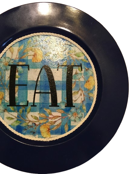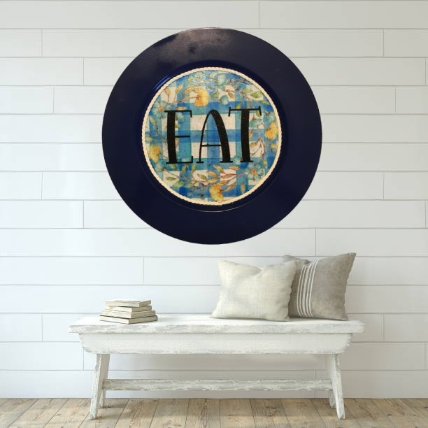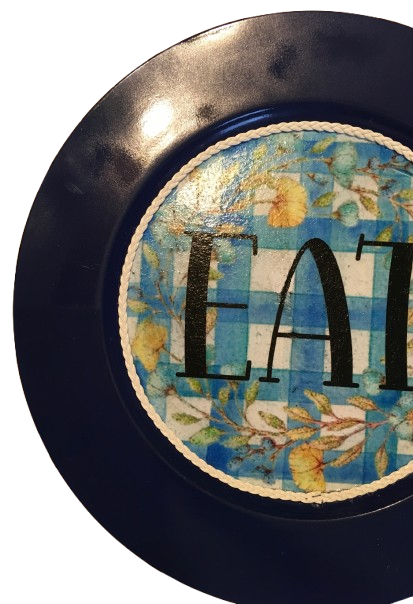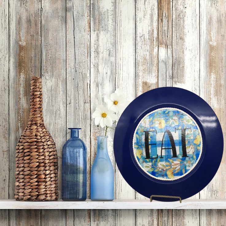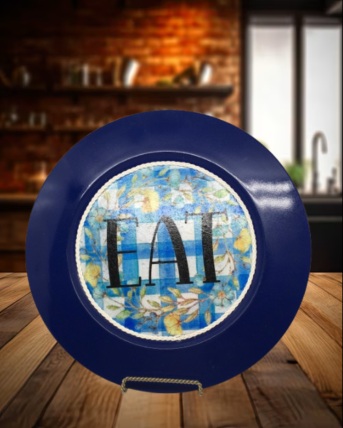 PLATE CHARGER NAVY BLUE PLASTIC ROUND DECOUPAGED Upcycled Repurposed Wall Art or Shelf Sitter EAT Kitchen Decor Home Decor Wall Art Gift WEDDING - JAMsCraftCloset