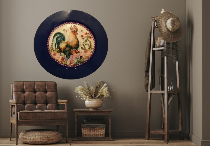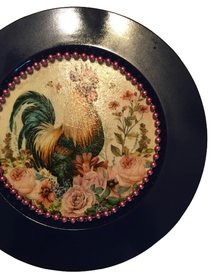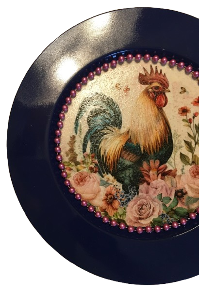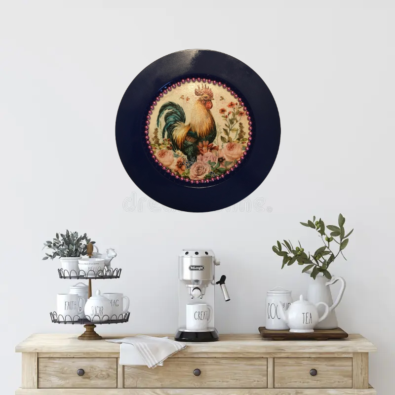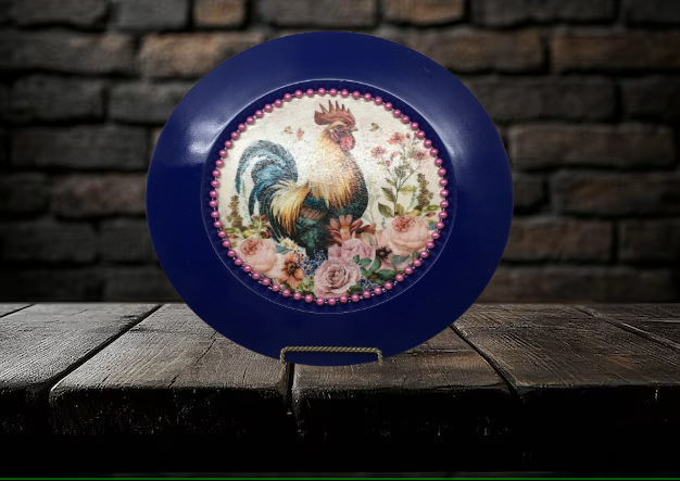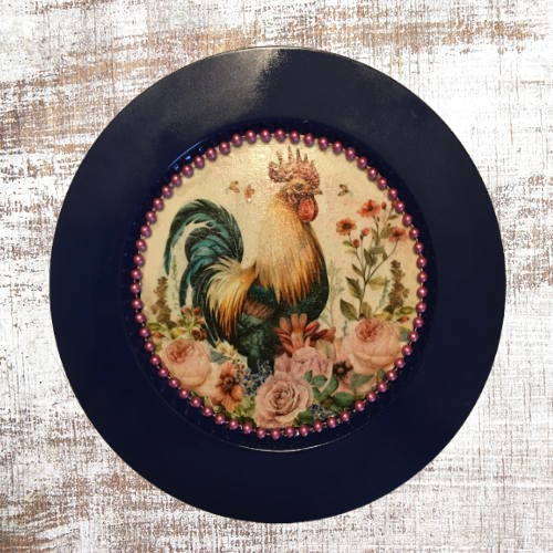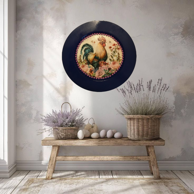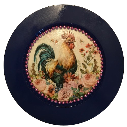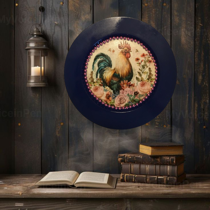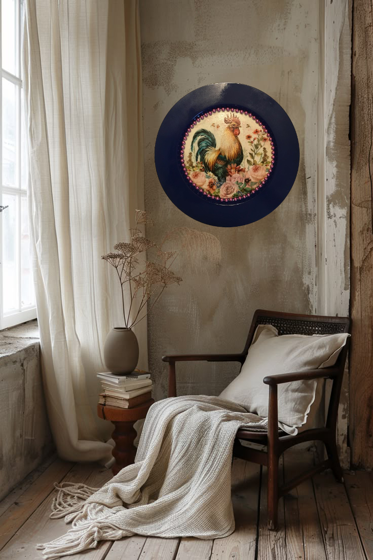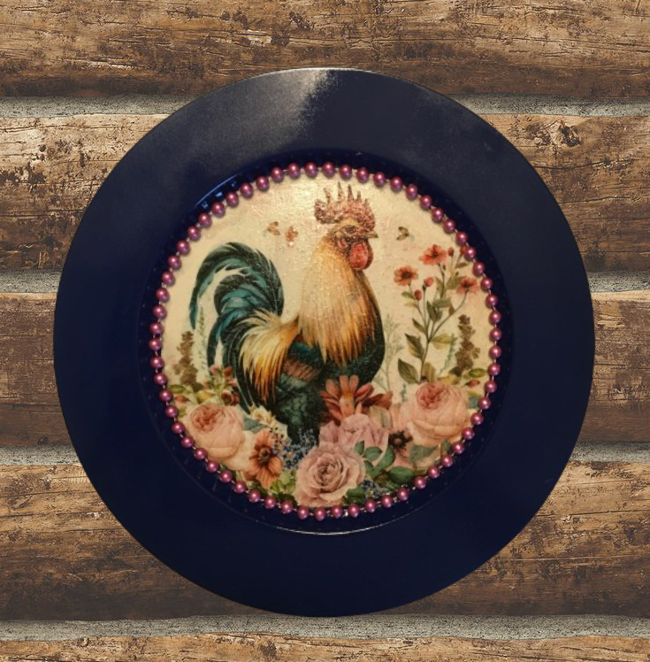PLATE CHARGER NAVY BLUE PLASTIC ROUND DECOUPAGED Upcycled Repurposed Wall Art or Shelf Sitter HEN PINK ROSES Kitchen Decor Home Decor Wall Art Gift WEDDING - JAMsCraftCloset