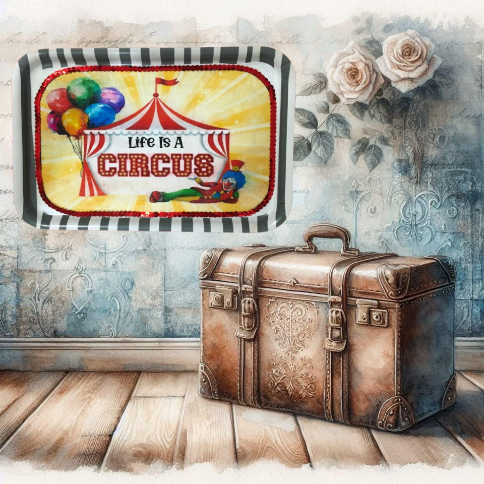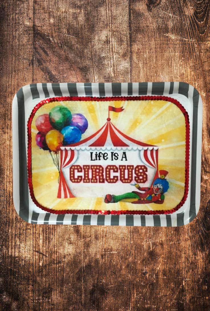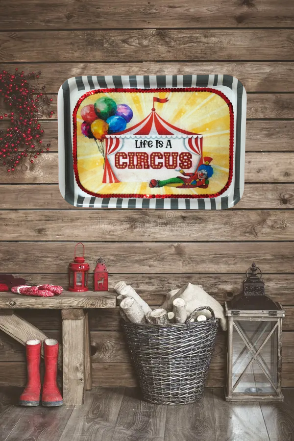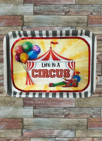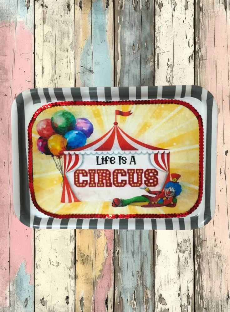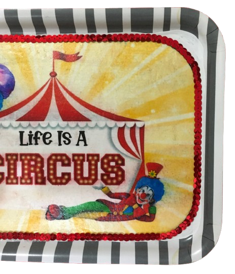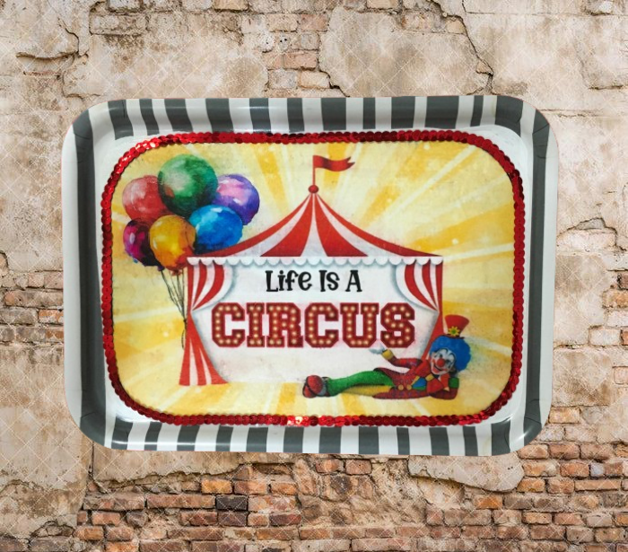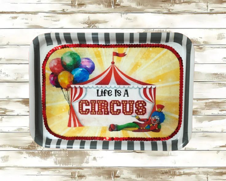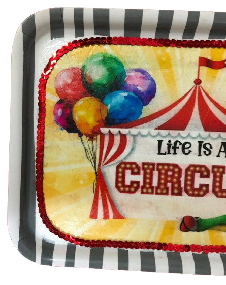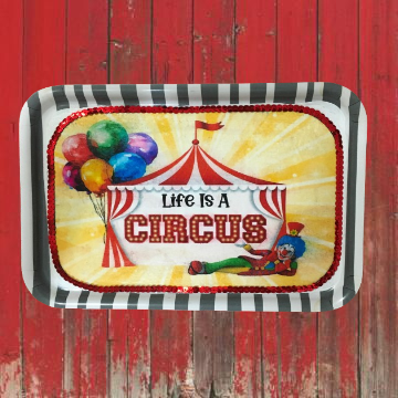 TRAY WHITE  GRAY STRIPED Plastic Rectangle Decoupaged Upcycled Repurposed Circus Theme LIFE IS A CIRCUS Wall Art Shelf Sitter Decor Wall Art Gift - JAMsCraftCloset