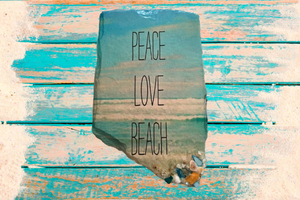 Antique West Virginia Roof Decoupaged PEACE LOVE BEACH - Beach Theme 3-D Embellishments Shells and Sand Handmade Wall Art Unique Beach Lake House Gift