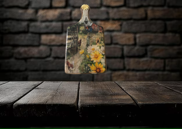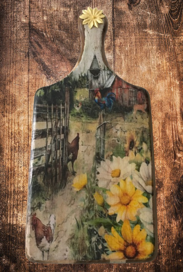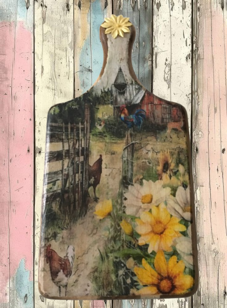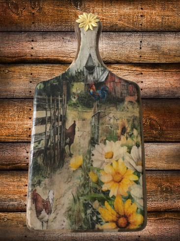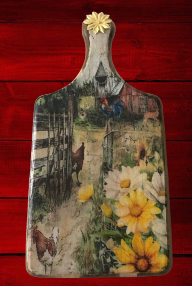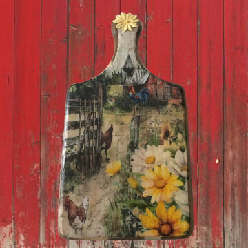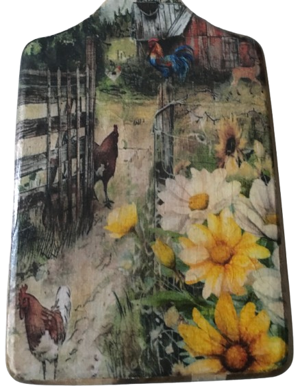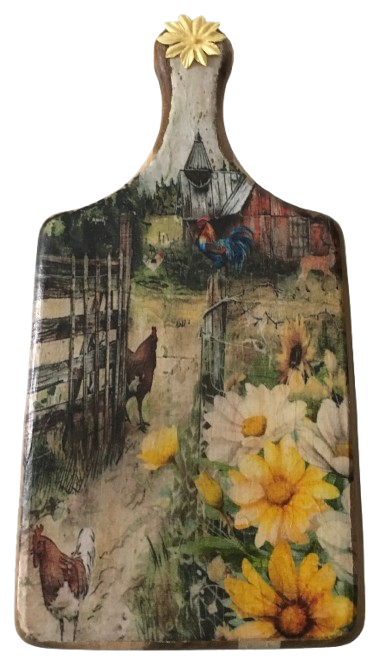 Bring a touch of rustic charm to your kitchen with this beautifully crafted cutting board. Adorned with a vibrant farm scene, it features playful chickens, a proud rooster, and blooming flowers that evoke the warmth of country life. The intricate details invite you to imagine the sounds and sights of a sunny day on the farm.